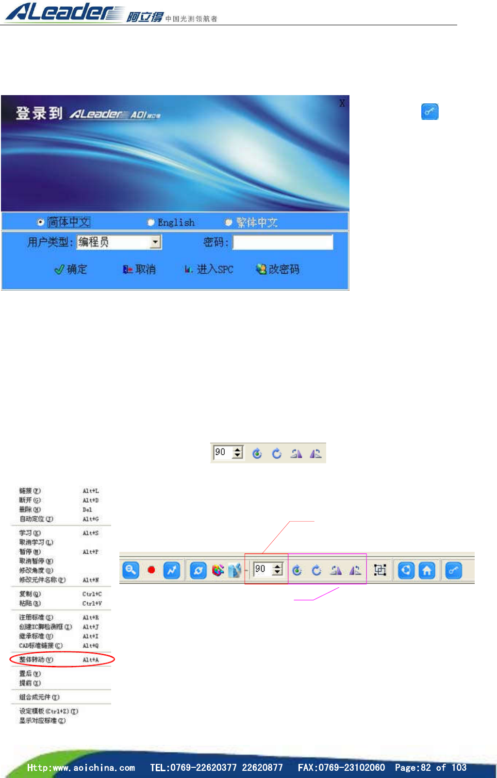 4.16 改变操作状态 如需要在编辑状态和操作状态之间切换(默认为操作状态) ,需要进行模式改变的操作 步骤:选择工具栏的 “ 重 新 登 陆 ” 图 标, 打开 “登录界面” 选择“用户类型”即 可。 4.17 修改元件角度 角度的旋转分为两种 : 整体旋转和本地旋转,整体旋转 是指“所有子件”都以中 心为基准的旋转, 本地旋转是指“每个子件”分开各自以中心旋转。 a) 整体旋转 步骤: 首先在编辑区选中需要被旋转的元件检测框, 鼠标…