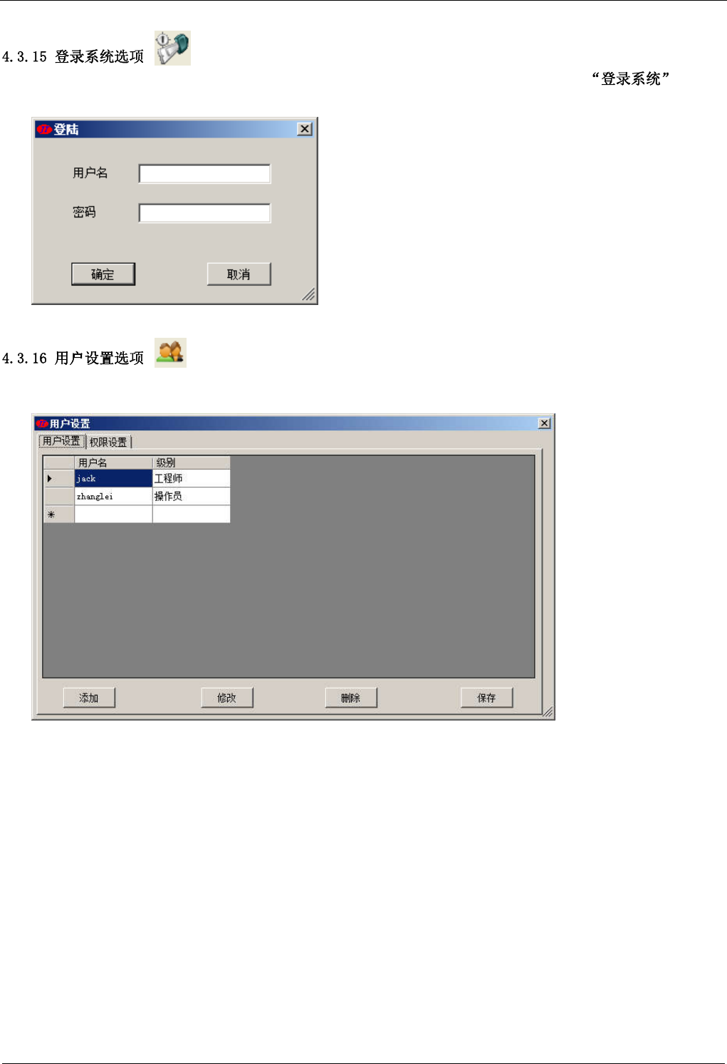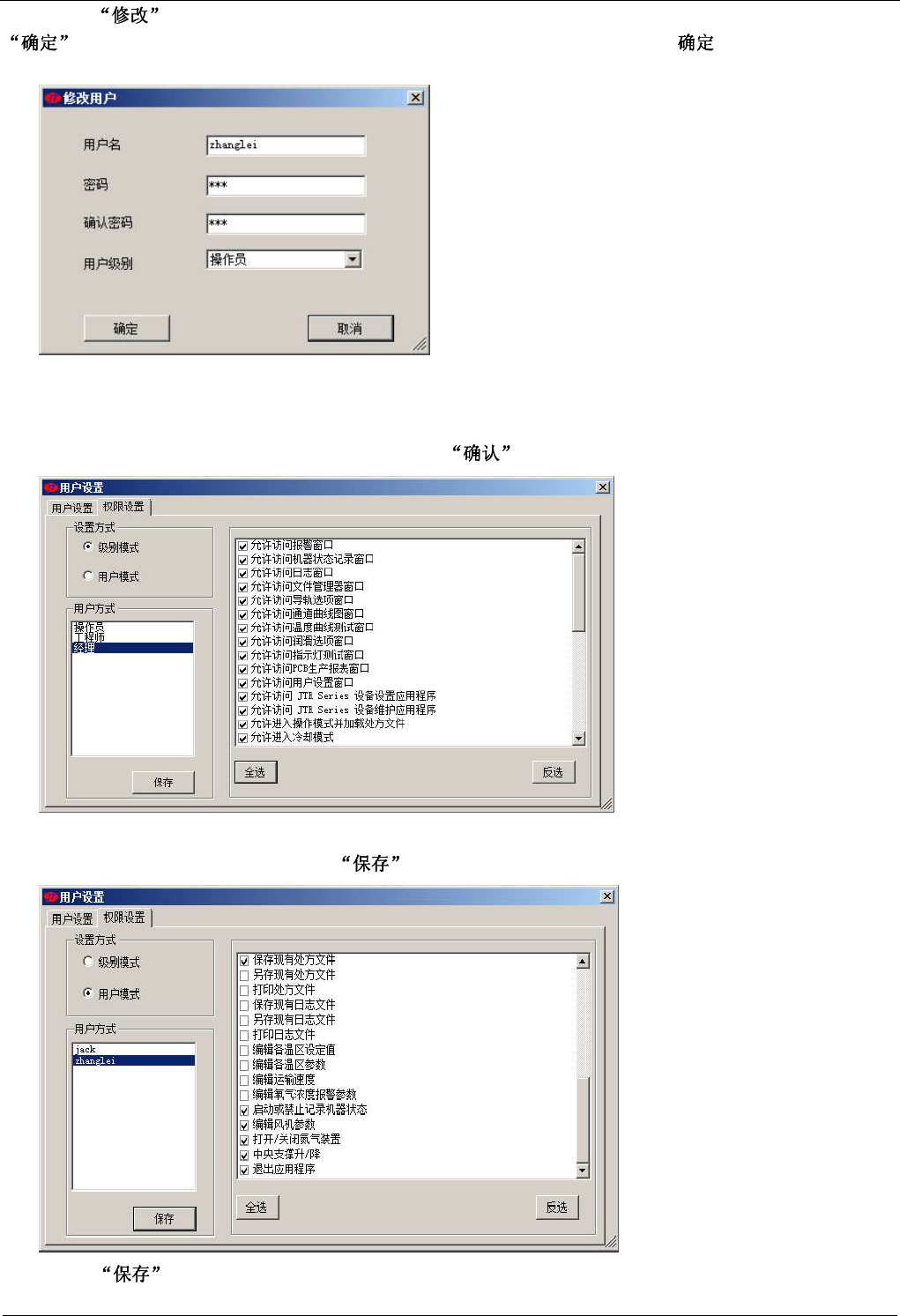 限栏中选择此用户所对应的权限,最后按 键,这样每个用户都可具有不同的权限,设置更灵活。