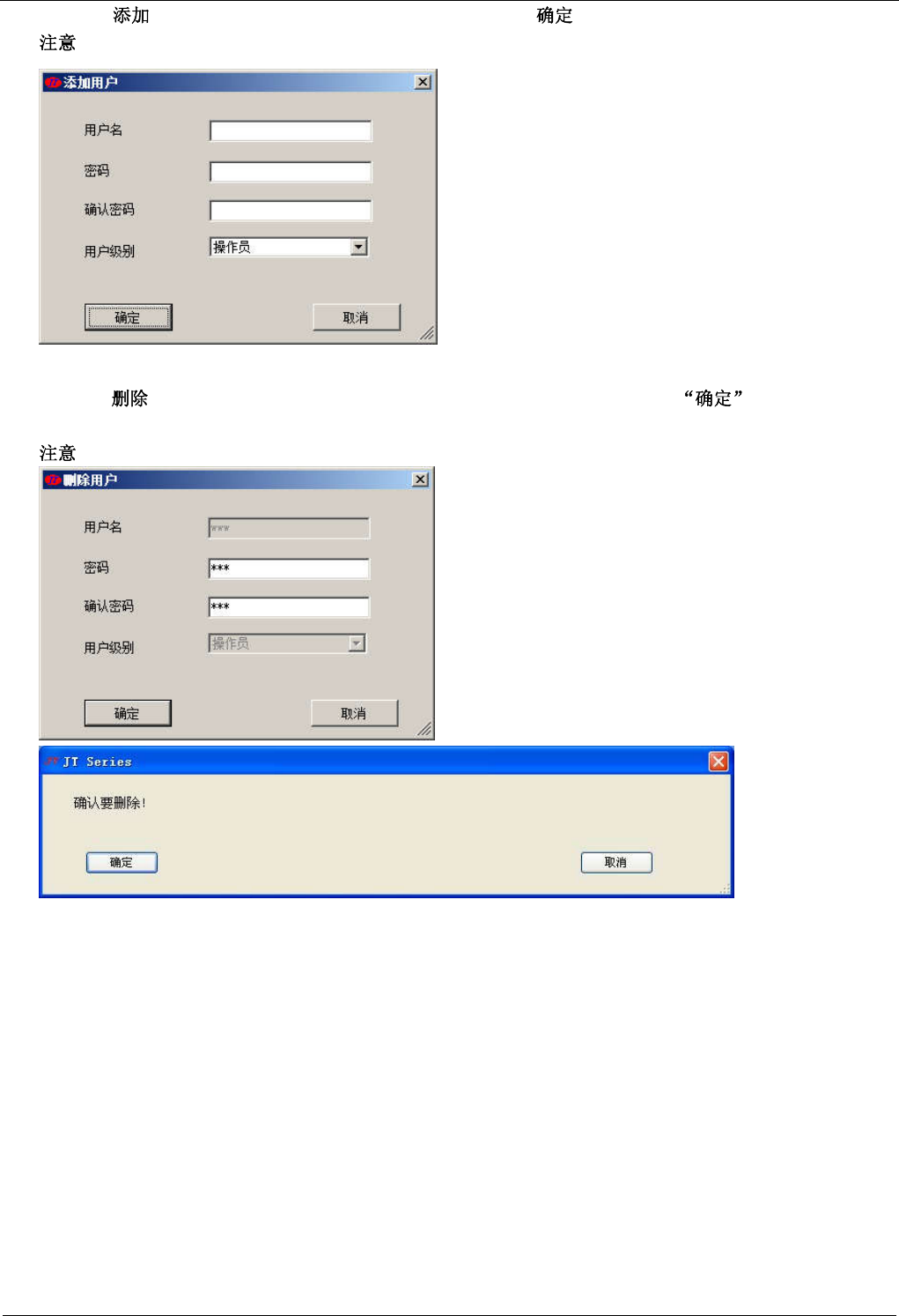 JTR 系列无铅回流焊机用户手册 软件操作 - 45 - 1 15 1.选择“ ”项时,需输入新增用户名、密码并确认。按“ ”后系统将自动保存并生效。 :请妥善记录用户名及密码,以免遗忘。 2.选择 “ ” 选项时如右图所示, 用户输入所需待删除的用户对应的密码。 按 按钮便会将此用户 删除。 :请慎用此选项。