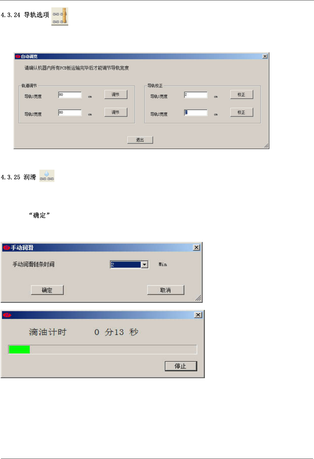 JTR 系列无铅回流焊机用户手册 软件操作 - 52 - 1 15 该按钮选项仅在用户选择了设备参数设置中的 “导轨宽度 调整” 中的 “自动” 选项时才会出现, 点击该按钮 进入如右图所示的窗口,在该窗口中输入导轨宽度的调节值与校正值对导轨宽度进行自动调节与校正。 此选项是用于用户认为系统运输链条自动润滑不够时使用, 当用户单击工具栏上此按钮后, 系统显示如右图 所示窗口,用户设定手动润滑时间 后,点击 按钮…