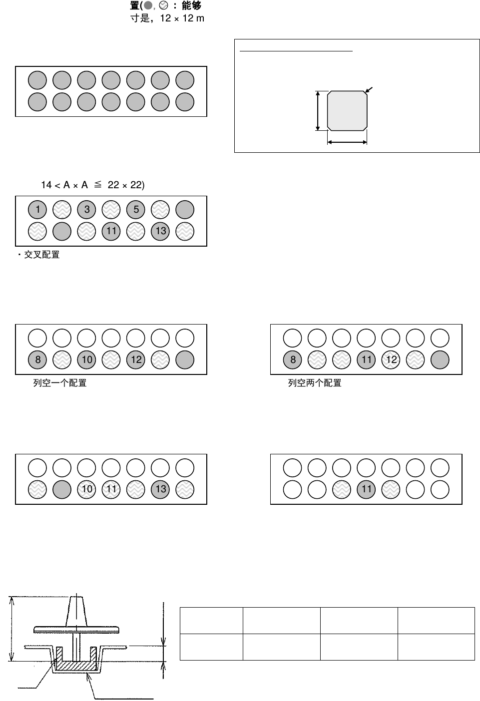 VM 102 20 23.0 721 - 17 - ■ 能够吸着的 元件尺 寸和吸嘴配 置 ( ● , : 能 够 吸着, ○ : 不能 吸着 ) 透过识别时能够吸着的 元件尺 寸是 , 12 × 1 2 m m 以下。 14 × 14 mm ( 对角 19. 1 mm) 以下的元件 ( A × A ≦ 14 × 1 4) ・ 只限小吸嘴 超过 14 × 14 mm ( 对角 19.1 mm ) ~ 22 × 22 mm (14 × 1…