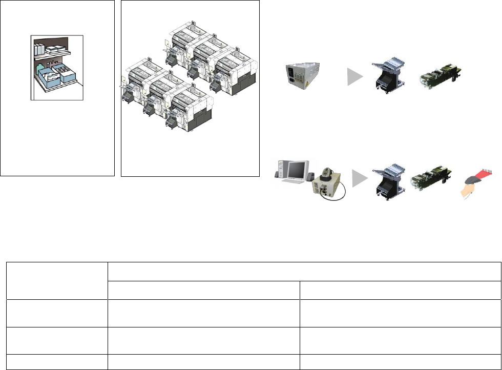 使用客户持有的预备交换台车和供料器,在生产中可以进行下一机种的准备,大幅度减少机种切换的损失时间。