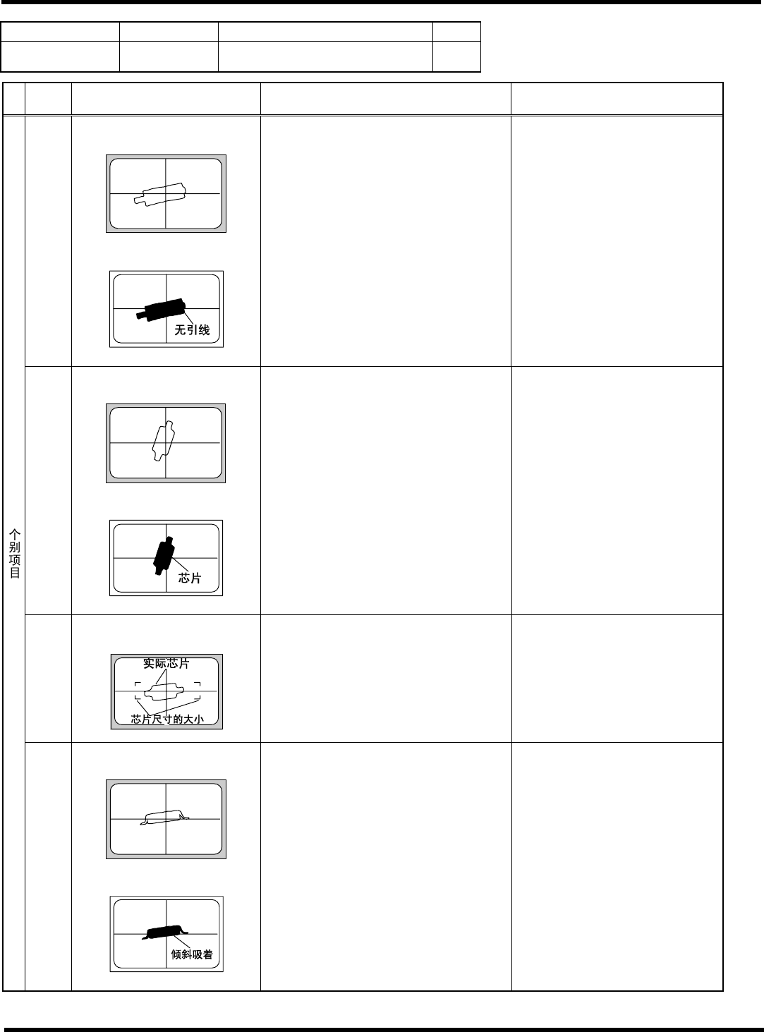 HGR14 附录 1.4 轮廓识别错误信息 附录 1-100 参考 No. 形状编号 类别 75 ~ 76, 82, 95, 152 2a S 微型 Di 、微型 Di 等 1/1 代码 内容 原因 对策 1) 吸着错误、吸着异常 ( 错误画面上只看见吸嘴的轮廓 ) 请确认吸着状态。 ( 确认芯片数据、高度检测系统 ) 2) 参考编号错误 请确认芯片数据的参考编号。 ( 芯片数据 ) 3) 部品异常 ( 引线弯曲等 ) 请检查部品的包装…