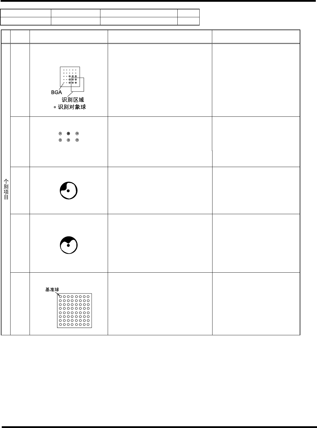HGR14 附录 1.4 轮廓识别错误信息 附录 1-124 参考 No. 形状编号 类别 201 ~ 205 4f BGA, CSP , ( µ BGA) , LGA 等 3/3 代码 内容 原因 对策 45 识别区域异常 识别对象球在可识别区域外 BGA 识别中,识别对象球在可识别区域 外 识别对象球 整体识别时, 全部球; 分割识别时, 各角 分别为全部球的 1/4 。 重新示教识别位置后进行识别 球脱落 请确认球排列的图形是…