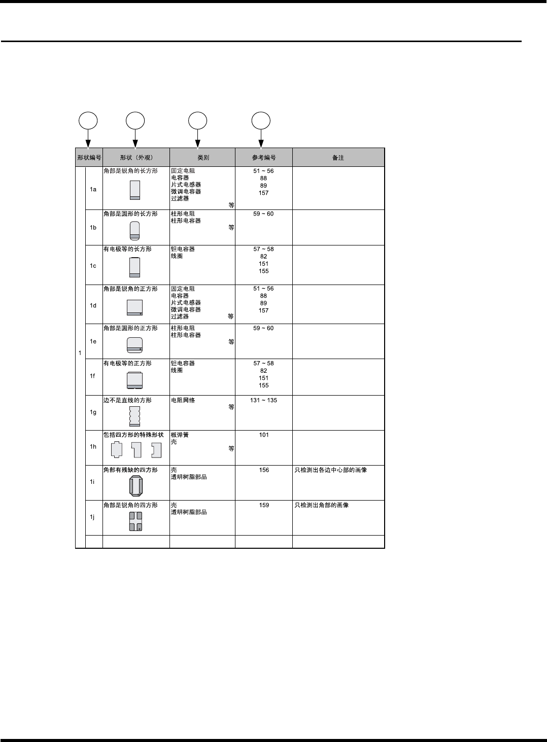 HGR14 附录 1.2 编制轮廓识别数据 附录 1-5 轮廓识别形状一览表 -1 < 方形形状 > ∗ 长边 ÷ 短边 ≤ 1.2 时,为正方形。 ∗ 长边 ÷ 短边 ≥ 1.2 时,为长方形。 形状编号 形状 ( 外观 ) 类别 参考编号 备注 1a 角部是锐角的长方形 固定电阻 电容器 片式电感器 微调电容器 过滤器 等 51 ~ 56 88 89 157 1b 角部是圆形的长方形 柱形电阻 柱形电容器 等 59 …