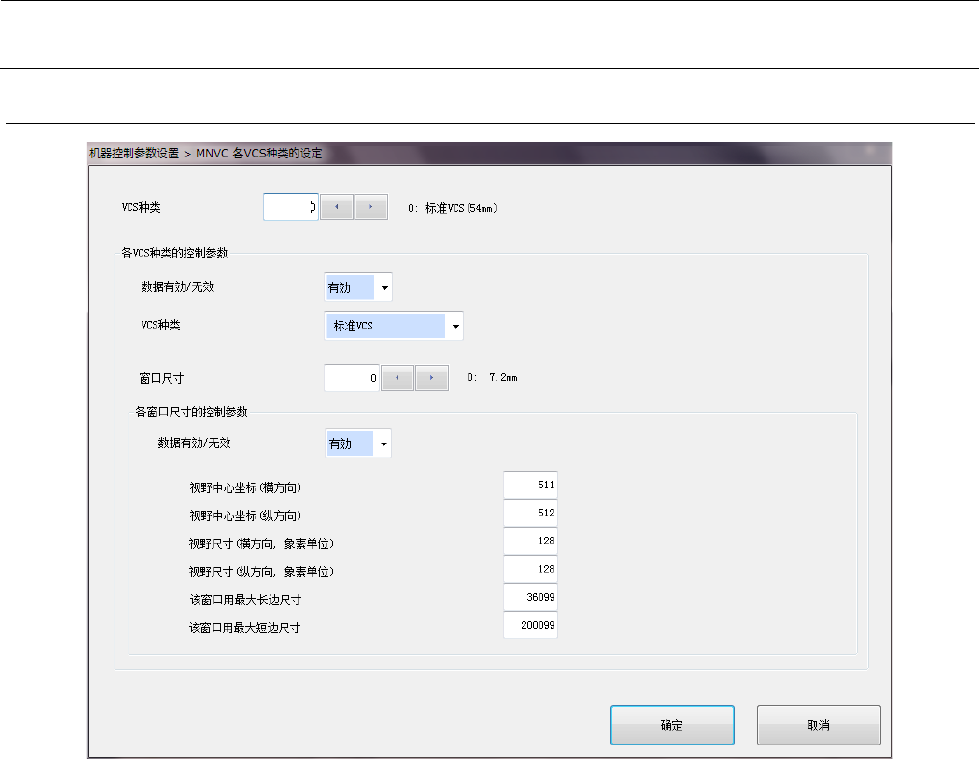 机器控制参数 2- 105 设定项目 2-4- 11 - 1 No. 项目 输入范围 单位 备考 最小值 最大值 1 VCS 种类 0 2 0 :标准 VCS 用 1 :高分辨率 VCS 用 2 各 VCS 种类的 控制参 数 数据有效/无效 0 1 0 :无效 1 :有效(默认) ※ 8 3 VCS 种类 参照 2-4- 11 - 2VCS 种类 4 窗口尺寸 0 31 mm 参照 2-4-11-3 窗口尺 寸 5 各窗口 尺寸的 控…
