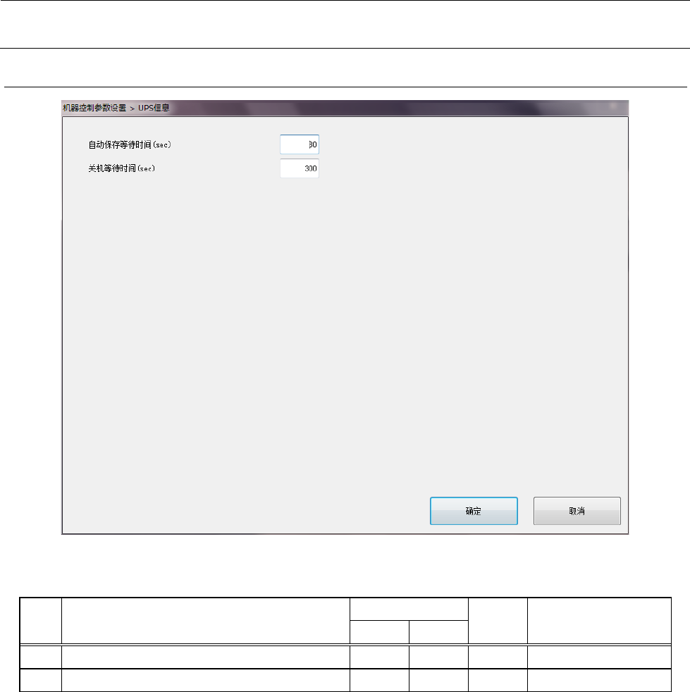 机器控制参数 2- 117 2-5- 3 UPS 信息 设定项目 2-5-3 - 1 No. 项目 输入范围 单位 备考 最小值 最大值 1 自动保存等待时间 [sec] sec 2 关机等待时间 [sec] sec
