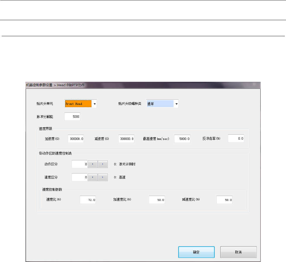 机器控制参数 2-8 设定项目 2-1-3 - 1 No. 项目 输入范围 单位 备考 最小值 最大值 1 贴片头单元 参照 2-1-3-2 贴片 头单元 2 贴片头吸嘴种类 参照 2-1-3-3 贴片 头吸嘴种类 3 脉冲分解能 1nm / Pulse 4 速度界限 加速度 - 10 10 G 5 减速度 - 10 10 G 6 最高速度 - 1000000 1000000 mm/sec 7 反冲击率 8 各动作区的 速度控制表 动作…