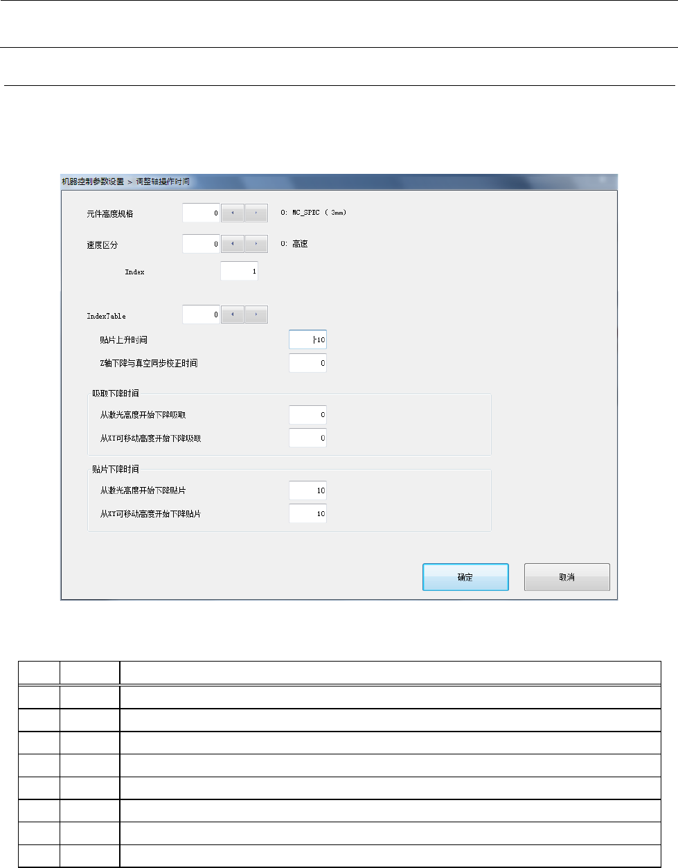 机器控制参数 2- 28 速度区分 2-1- 14 - 2 设定项目 2-1- 14 - 3 No. 项目 输入范围 单位 备考 最小值 最大值 1 贴片上升时间 - 32768 32767 ms 2 Z 轴下降与真空同步校正时间 - 32768 32767 ms 3 从激光高度开始下降吸取 - 32768 32767 ms 4 从 XY 可移动高度开始下降吸取 - 32768 32767 ms 5 从激光高度开始下降贴片 - 3276…