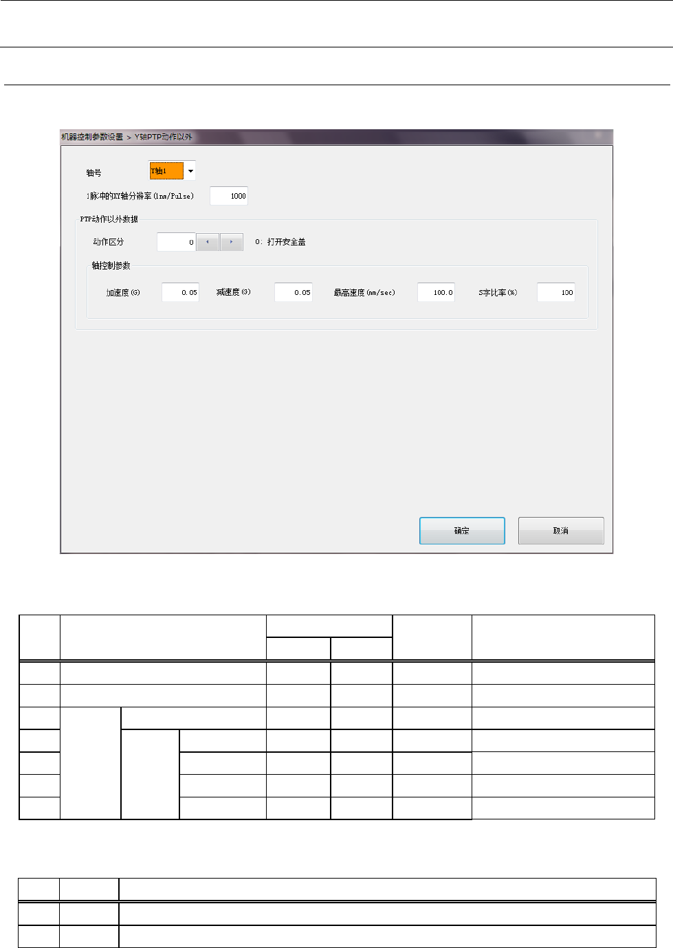 机器控制参数 2- 37 2-2- 4 Y 轴 PTP 动作以外 如 将“ 轴号” 、 “动作区分” 设置为欲编辑的索引, 即可 对所设定的区分中的轴控制参数进行编辑。 设定项目 2-2-4 - 1 No. 项目 输入范围 单位 备考 最小值 最大值 1 轴号 参照 2-2-4-2 轴号 2 1 脉冲的 XY 轴分辨率 nm / Puls e 3 PTP 动 作以外 数据 动作区分 0 14 参照 2-2-4-3 动作区分 4 轴控制 …