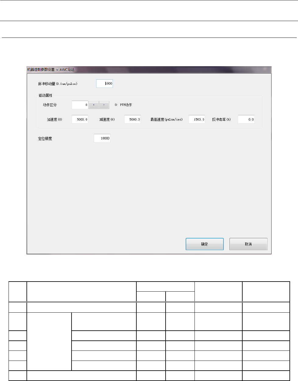 机器控制参数 2- 80 2-3- 3 AWC 马达 如将驱动属性内的 “动作区分 ” 设置为欲编 辑的索引, 即可对所设置的区分 中的 “加速度” 、 “减 速度”、“最高速度”、 “反冲击率”进行编辑。 设定项目 2-3-3 - 1 No. 项目 输入范围 单位 备考 最小值 最大值 1 脉冲移动量 0.1 μ m/p ulse 2 驱动属性 动作区分 0 9 参照 2-3-3-2 动作区分 3 加速度 - 100000 10000…