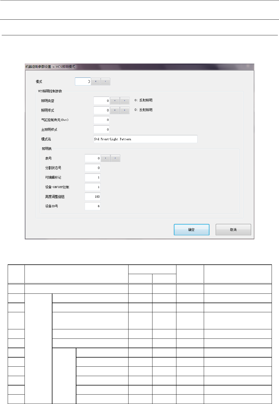 如将“模式”设置为欲编辑的索引,即可对所设置的区分中的“VCS照明控制参数”进行编辑。