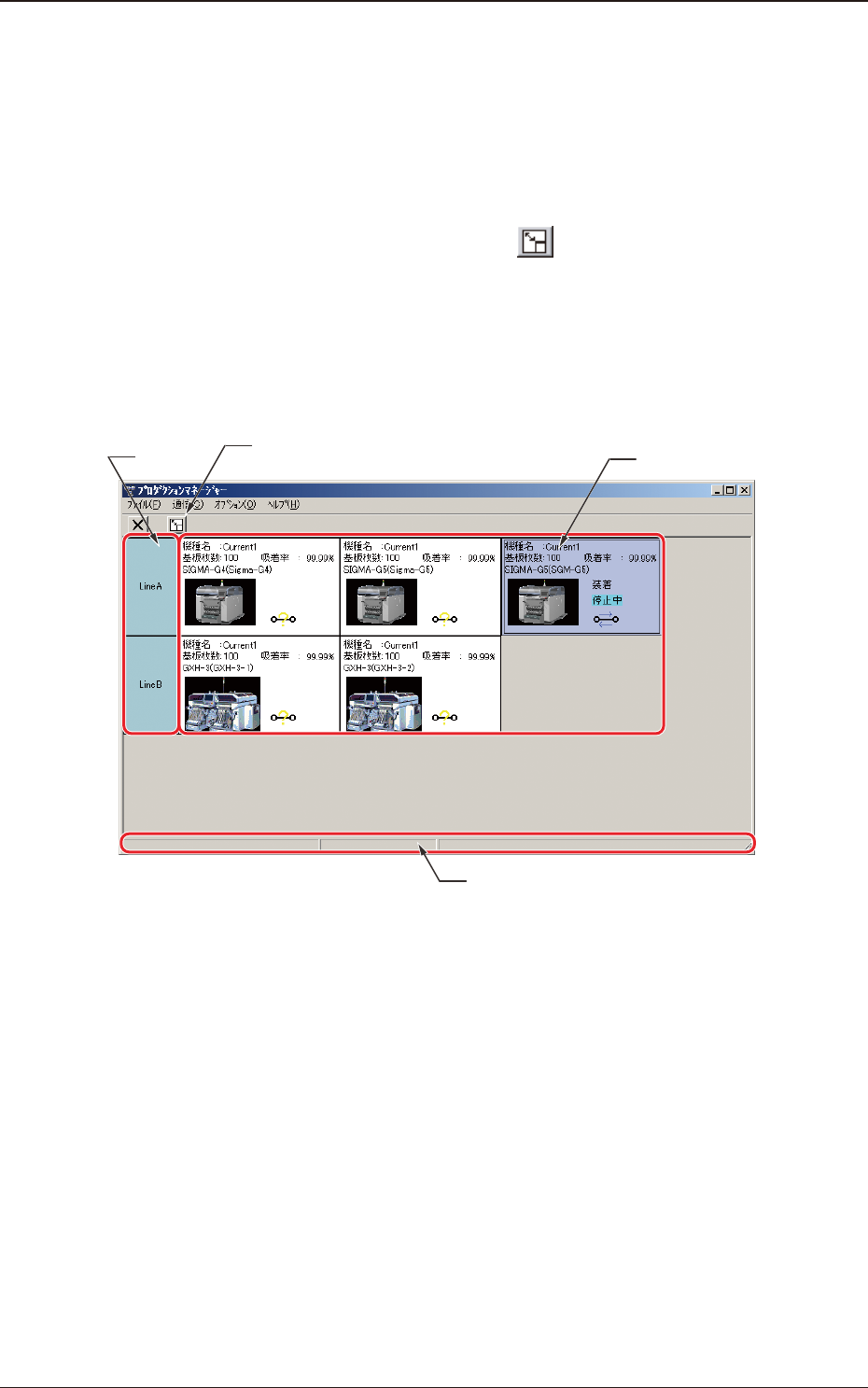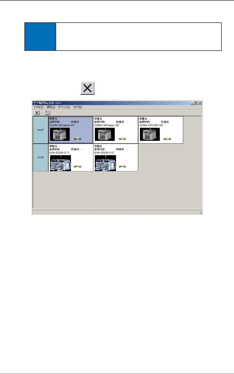 8 OM-1 139 3. プロダクションマネージャの終了 通知 • プロダクションマネージャの終了は、ステータスの監視機能を 停止させてから終了させてください。 異常終了や PC の無応答などの原因となるおそれがあります。 終了方法 • メニューバーの [ ファイル ]-[ 終了 ] コマンドを選択すると、プ ロダクションマネージャが終了します。 終了ボタン < > をクリックしても終了することができます。 Fig…