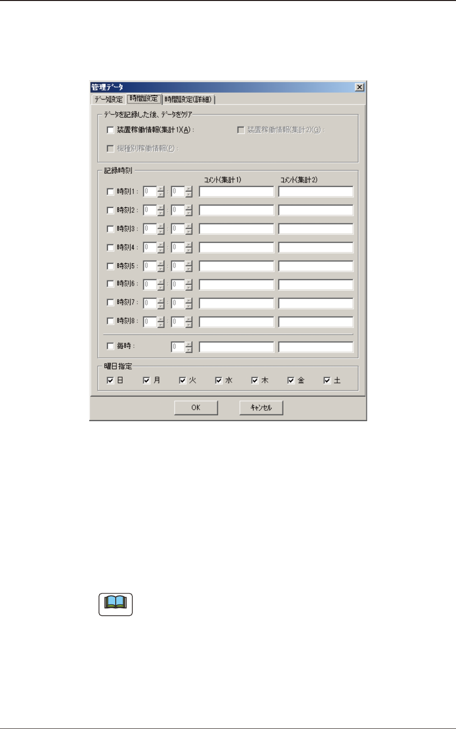 21 OM-1 139 7.2 “管理データ”画面 7.2.2 “時間設定”画面 “管理データ”画面の“時間設定”タブを選択すると、以下の画面が 表示されます。 Fig. 11 データを記録した後、データをクリア 時刻指定、 および日時指定で自動受信した管理データで受信(記 録)後、データクリアする管理データの種類を設定します。 • 設定範囲 “装置稼働情報 ( 集計 1)”/“装置稼働情報 ( 集計 2)”/“機種 別稼働情報”…