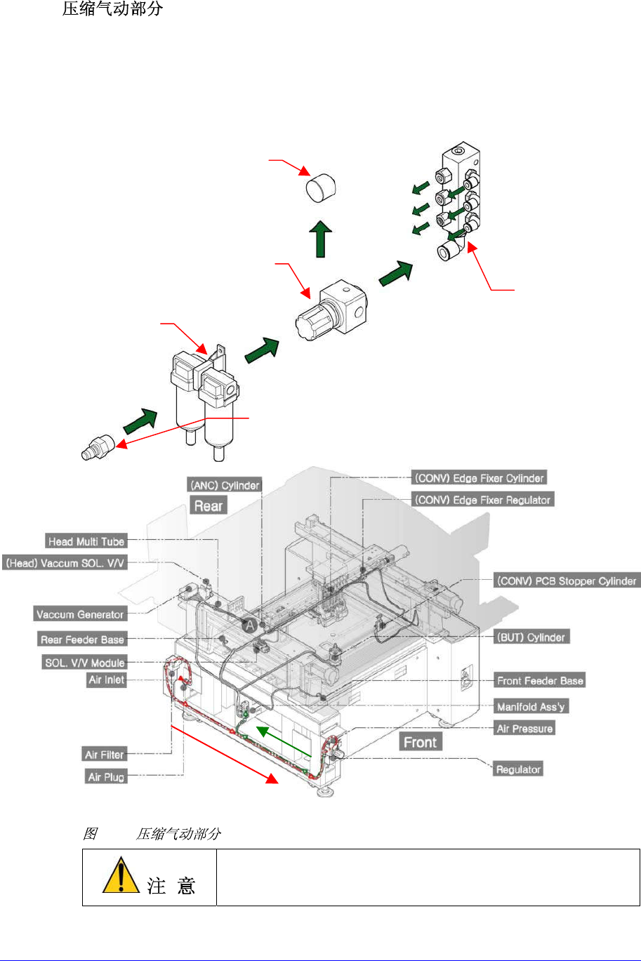 6-23 6.12. 空压一般 设置为 0.45 ~ 0.5 5 Mpa (4. 6 ~ 5.6 k gf/c m 2 ) 使用 ,通过设 备后面下端 的 main inlet 供给。 供给空气的一部分使用于运行设置 在 Feeder Base 的 SM 给料器 , 一部分使用于驱动 ANC , 另外一部分使用于贴装头发生真空 , 其余一部分使用于运行输送器的各 Stopper 及 Backup Table 。 6-21 如果 压力 低…