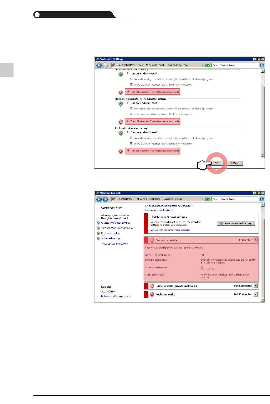 3-6 {TzYG|˅Gn {TzYG|˅Gn STEP4. 选择了 <Turn of f W indows Firewall (not recommended)> 选项按钮后, 单 击 <OK> 按钮 STEP5. 确认防火墙是否被解除