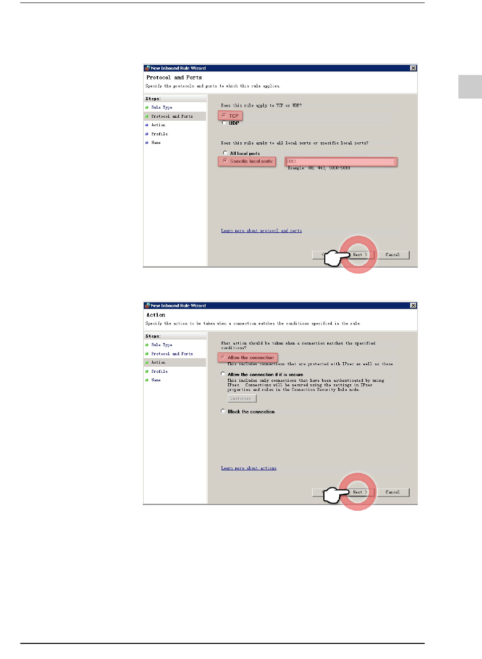 3-11 PC 配置及软件前置安装 STEP3. 选择 <TCP> 或 <UDP> 选项按钮后, 输入要在特定远程端口上打开 的端口号, 然后单击 <Next> 按钮。 STEP4. 选择了 <Al low the connection> 选项按钮后, 单击 <Next> 按钮