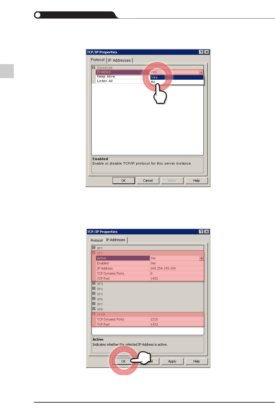 3-32 {TzYG|˅Gn {TzYG|˅Gn STEP3. 选择了 “Protocol” 选项卡后, 在 <Enabled> 组合框选择 “Y es” 。 STEP4. 选择了 “IP Addresses” 选项卡后, 在 “IP2” 的 <Enabled> 组合框 选择 “Y es” ,然 后在 <TCP Port> 编辑框输入端口值。…