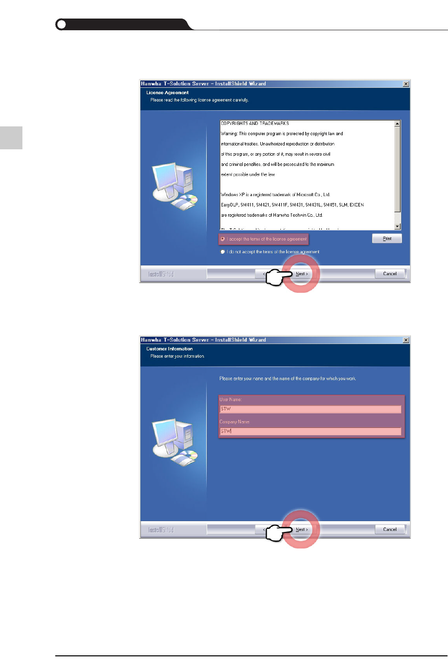 4-2 {TzYG|˅Gn {TzYG|˅Gn STEP2. 查看著作权相关信息后, 单击 <Next> 按钮 查看 T–Solu tion 的商标及 著作权相关事项。 STEP3. 输入使用者名与公司名后, 单击 <Next> 按钮