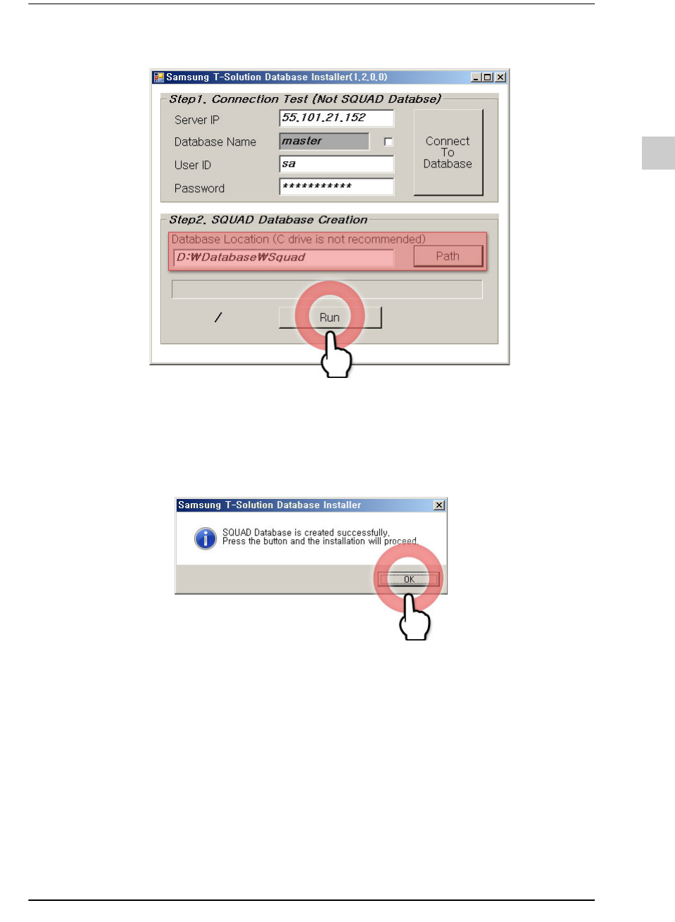 4-6 {TzYG|˅Gn {TzYG|˅Gn STEP8. 输入数据库信息后, 单击 <Connect T o Database> 按钮确认数据库连接 输入数据库的信息后,单击 <Connect To Database> 按钮并检查是否准确 地连接到数据库。这时候, 这时 候,所输入的数据库信息应该 和安装 MS-SQL Server 时输入的管理员账…