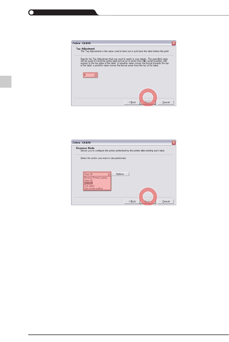STEP10. 设置了印刷前的条形码标签纸冗余输出长度后,单击<Next> 按钮