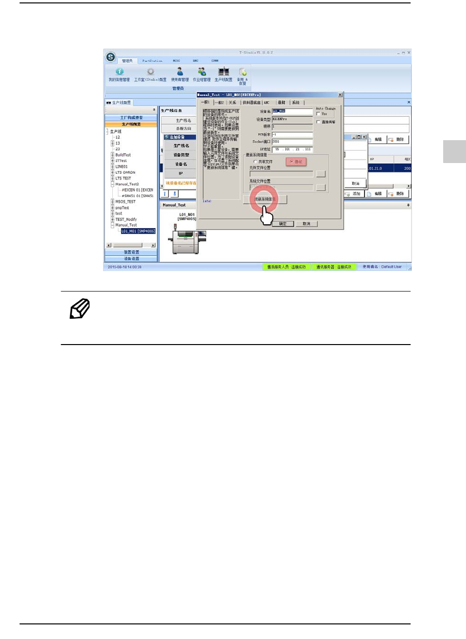 6-11 初始设置 STEP7. 选择协议 (P) 后, 单 击 < 更新系统信息 > 按钮 实行系统更新,读入设备的经过 更改的设置信息后更新成最新 状态。 备注 添加贴片机 (Chip Mounter) 时, 如果没有选择正确的设备类 型, 将无法进行系统更新 (Update System Info.) 。