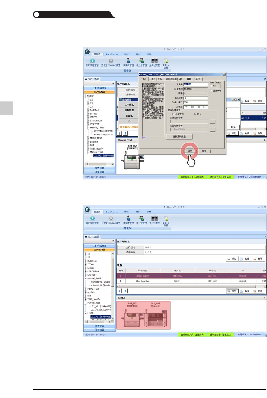 登记 LINE2 上使用的丝印机 (SMP400S) 与贴片机 (SM421)。