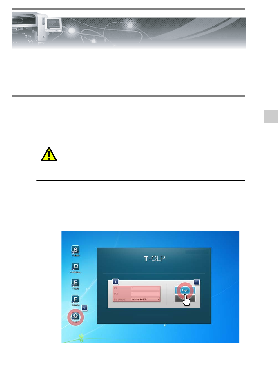 8-1 Chapter 8 C h a p t e r 8 . 运行参考事项 8.1. T-OLP 配置 注意 如果在使用 Line OLP 时 DAS 、 Line OLP 没有处于实行状态, 不会 把设备所修改的所有信息应用于 Server ,因 此 DAS 、 Line OLP 随 时都要处于实行状态。 8.1.1. 设置 One Part DB 设定 One Part DB 的方法如下。 STEP1. 实行 T- O L P 输…