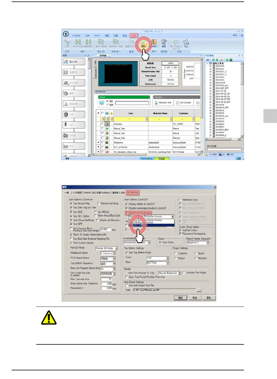 8-5 运行参考事项 STEP2. 选择 “ 工具 ” 菜单后, 单击 < 属性 > 按钮 STEP3. 选择 “IN I Settings” 选项卡后, 选择 <Use Exclusive Access> 复选框, 然后选 择 “Line OLP Editable” 注意 请解除 Disab le rearranging feeder in LineOLP 的圈选状态。 否则, 发生了有关 Pickup Z 的…