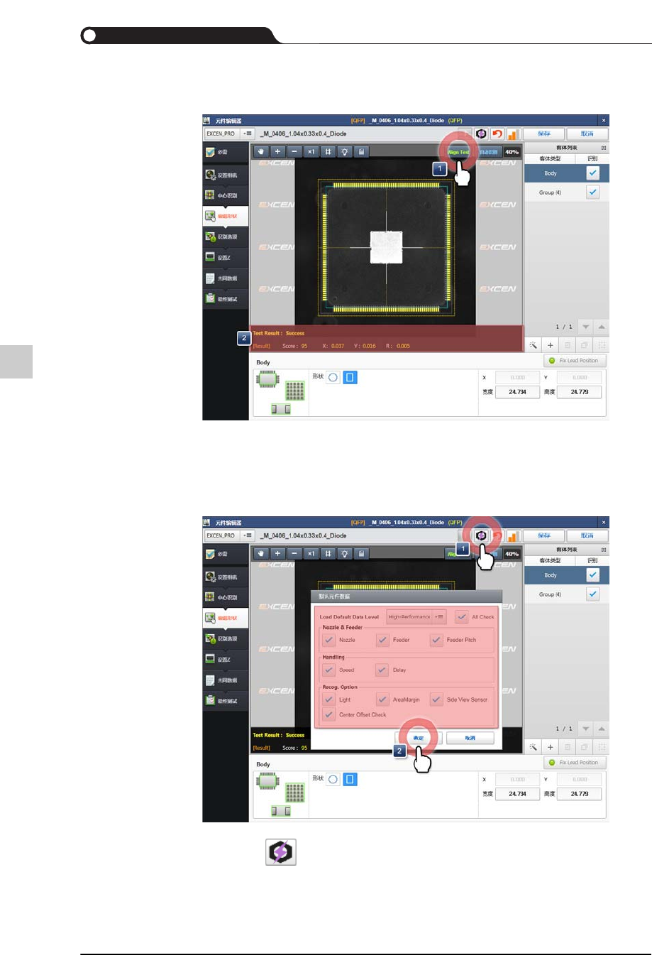 10-19 登记新元件 备注 如果无法自动补正 ROI 与元件登 记角度, 则单击 < 手动 ROI> 按钮与 < 手动排序 > 按钮后以手动方式设置 ROI 与元件登记角 度。 STEP14. 在 “ 编辑形状 ” 菜单单击 < 自动识别 > 按钮 1) 单击 < 自动识别 > 按钮 2) 查看结果后单击 <OK> 按钮