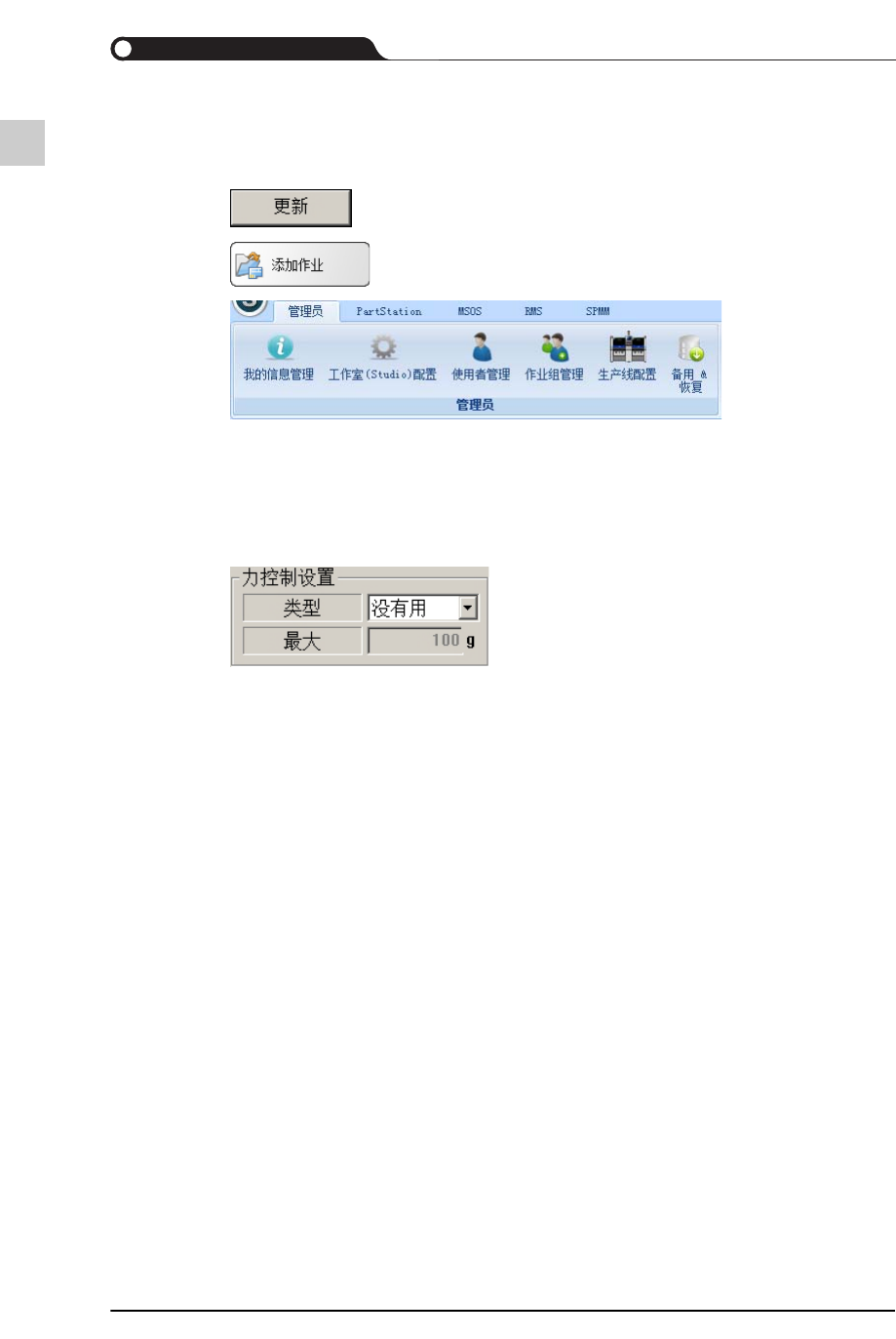 xxiv {TzYG|˅Gn {TzYG|˅Gn 按钮 单击时实行特定作业。 领域 该部分汇集了前面说明的项。 本说明书以领域的名称为基准命名为 “<x x> 领域 ” 。 例如 : < 力控制设置 > 群