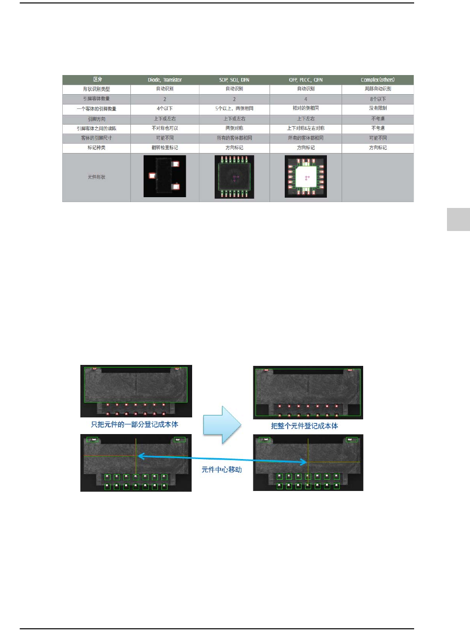 10-48 {TzYG|˅Gn {TzYG|˅Gn 10.5.5.3. Leaded - Complex 元件的登 记类型 备注 以手动方式完成了 Complex 元件的图像识别参数登记后, 请查 看元件识别测试结果。 如果没有异常就在 “ 最终测试 ” 菜单对元件进行识 别测试多 次。 设置有关识别的选项及其它参数的 方法, 在 WEB 手册, 请参阅 " 一部分自…