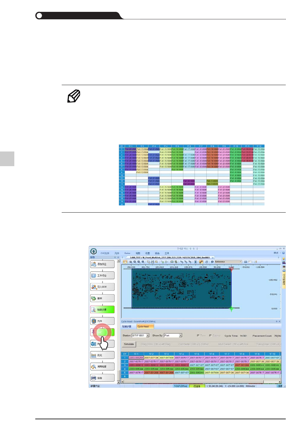 11-41 优化 PCB 程序 STEP5. 按照相同方式从安装在 1R-15 的供料器拿掉一部分贴装点后把贴装点移动 到安装在 2R-14 的供料器 , 然后把该供料器的贴装点予以固定 贴装点固定完毕后,在固定了所 有的供料器后实行优化并查看 优化结 果。