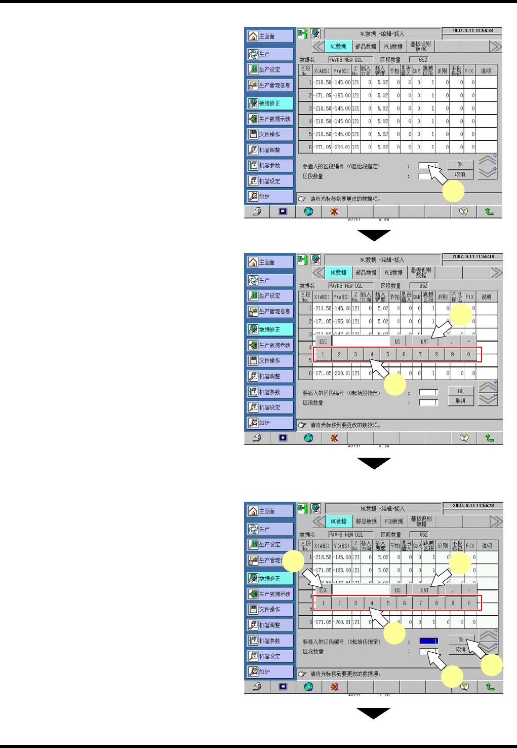 AV131 编程手册 3.2 新 NC 数据的编制 和编辑 D79PCC-43- 080-B0 3.2- 7 12. 输入各参数 项的数据 (1) 按动参数的输入 栏。 显示数字 键窗口。 (2) 对各区段的参数 栏输入数据。 (3) 按 [EN T] 进行登 录。 继续输入时, 请从步 骤 (1) 起反复进行操 作。 (4) 按 [ESC] , 关闭数 值输入窗口。 (5) 可根据指示信息 的注释确认输 入值。 (1) (3) (2)…