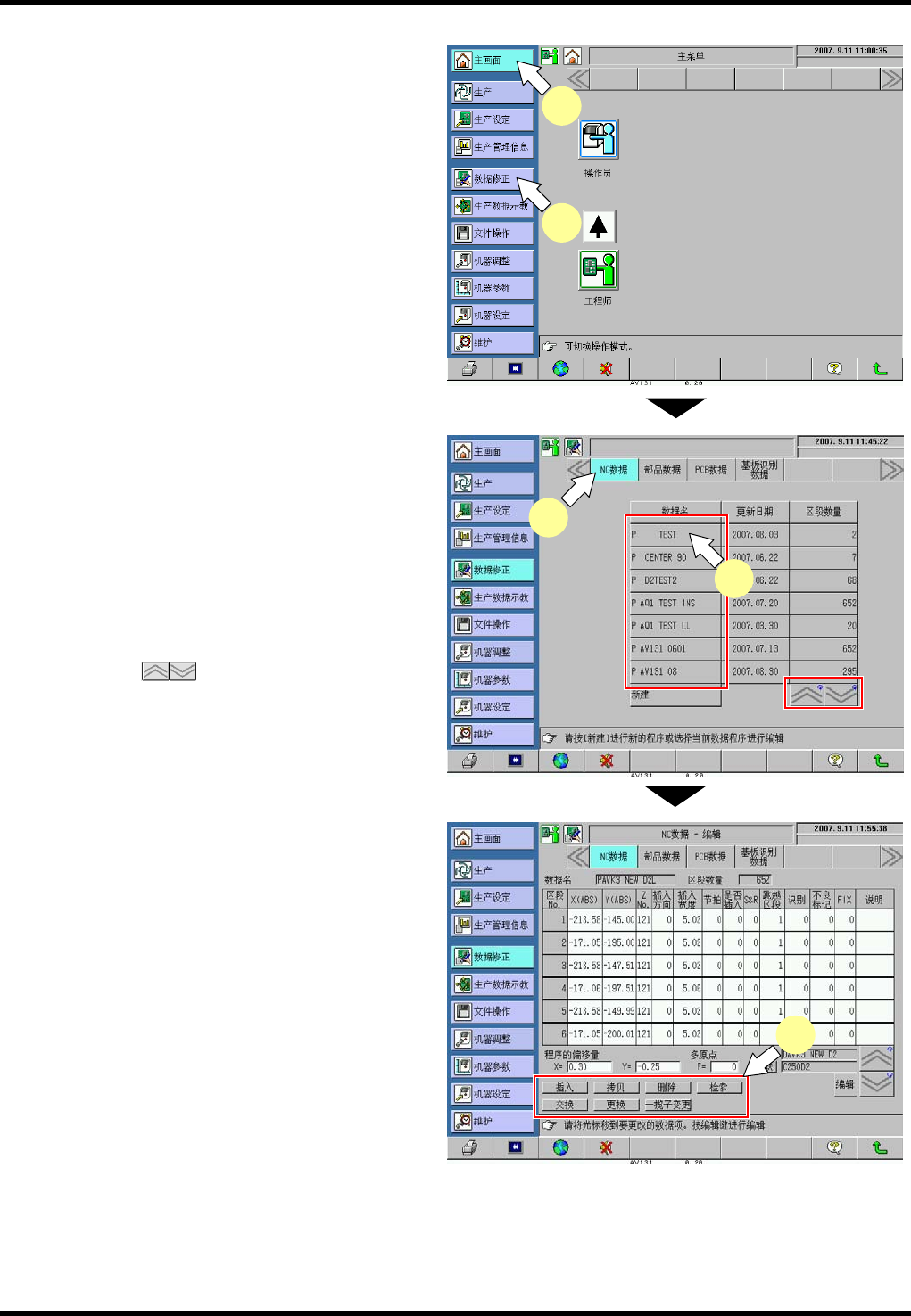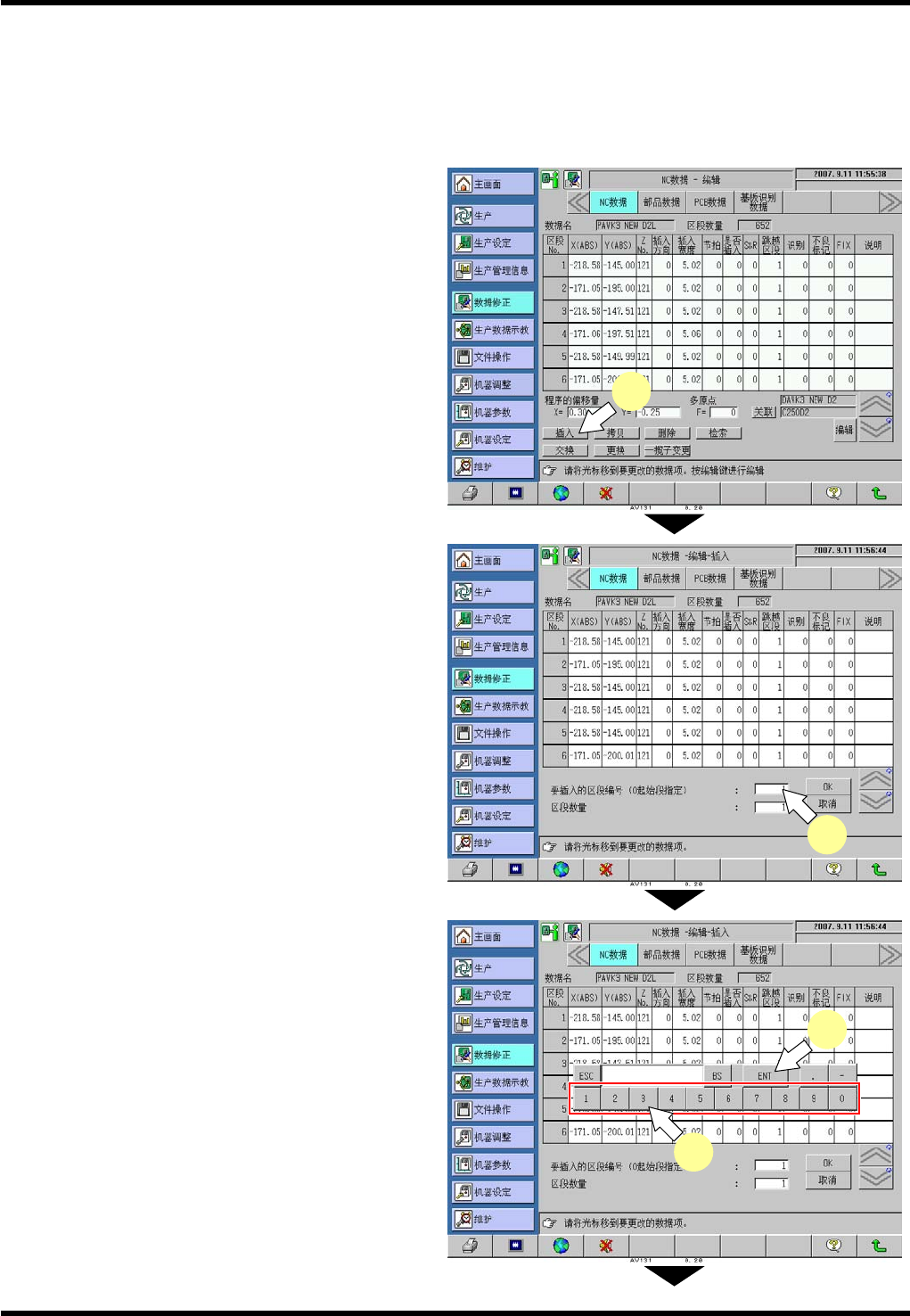 AV131 编程手册 3.2 新 NC 数据的编制 和编辑 D79PCC-43- 080-B0 3.2- 1 1 插入步骤 在要增加 NC 数据的 区段时使用: 在 NC 数据的区段与区段之 间增加新的区 段; 在 NC 数据最后区段的后面 增加新的区段 ; 在 NC 数据第一区段之前增 加新的区段。 2. 1. 选择插入 功能。 按下 [ 插入 ] 。 2. 指定要插 入的位置和插 入的区段数量 。 例:要在区段 3 与区段 4 …