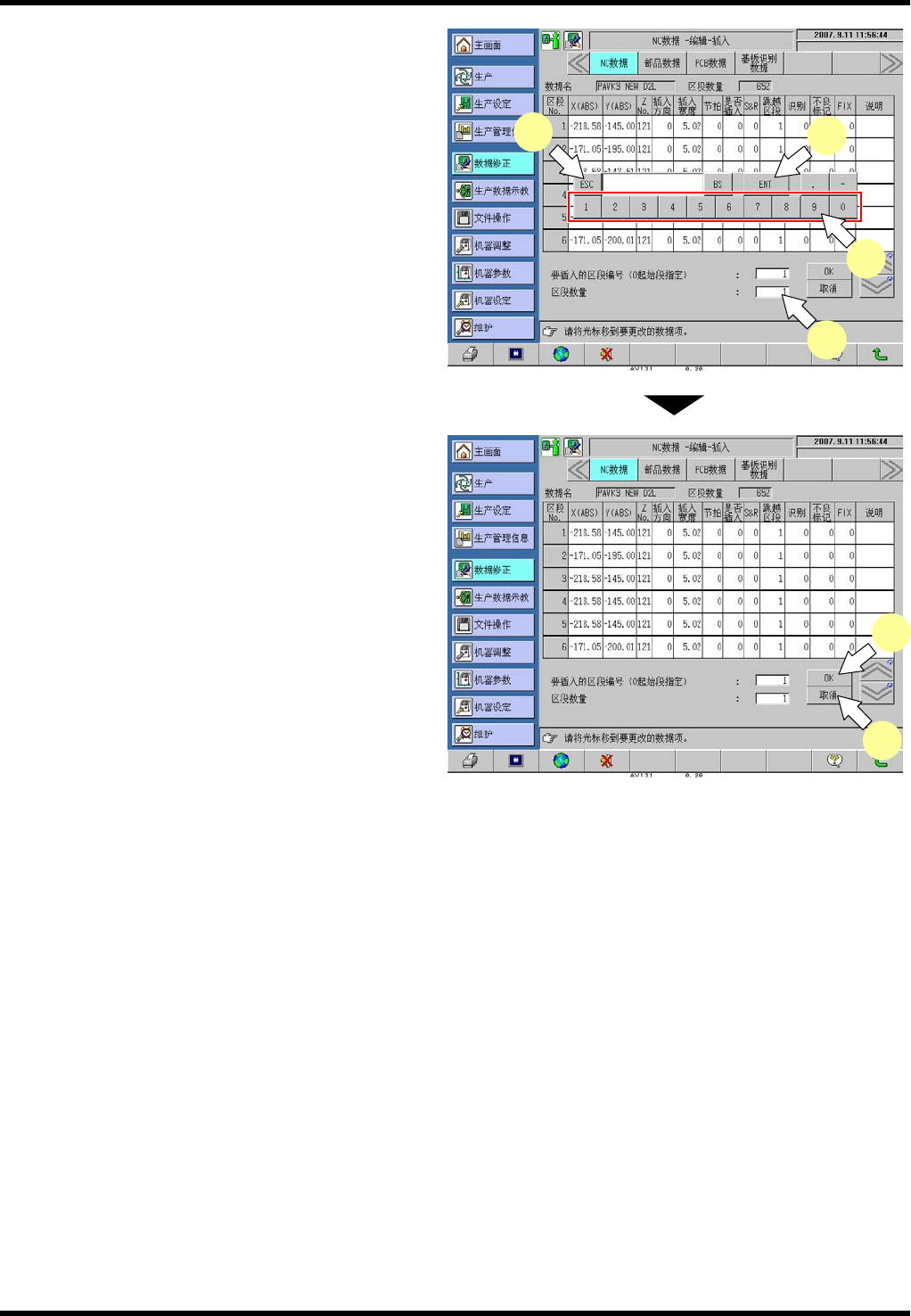 (1) 按动区段编号的输入栏,显示数字键窗