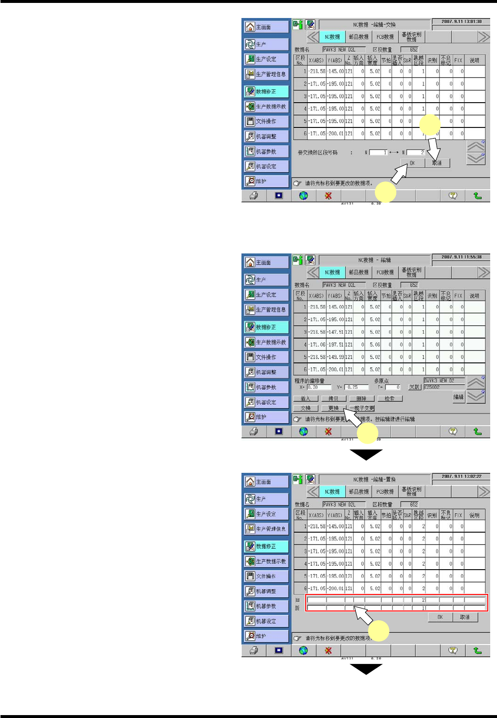 AV131 编程手册 3.2 新 NC 数据的编制 和编辑 D79PCC-43- 080-B0 3.2- 20 (2) 指定旧、新数据 。 例:指定旧 Z No . 栏,输入 “1 ” 之后, 按 [ENT ] 键确 定。 指定新 Z No. 栏, 输入 “5” 之后 , 按 [EN T] 键确定 。。 (3) 按 [ESC] , 关闭数 值输入窗口。 3. 执行更换 。 (1) 按下 [OK ] 后就执行 更换, 并自动返 回 到 “…