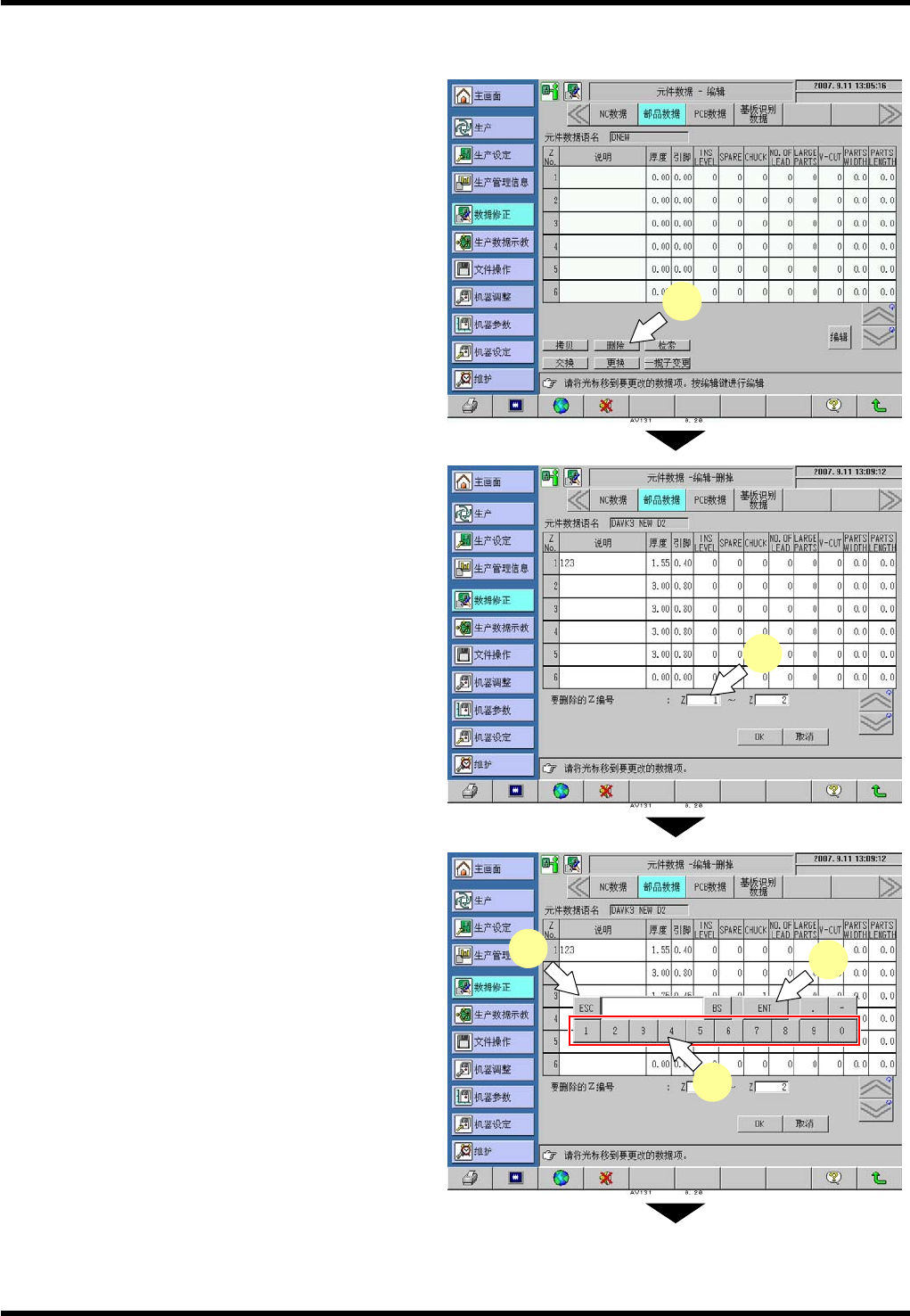 AV131 编程手册 4.2 新元件 数据的编制和 编辑 D79PCC-4R- 050-B0 4.2- 10 (3) 按拷贝目标位置的 Z 编号输入栏。 (4) 输入拷贝目标位 置的 Z 编号 。 例:按 [1 ][1] ,再按 [ENT ] 确定 。 (5) 按 [ESC] , 关闭数 值输入窗口。 3. 执行拷贝 。 (1) 按下 [OK ] 后就 执行拷贝,并 自动 返回到编 辑基本画面。 例:就将 Z9 供料器至 Z10 供料器…