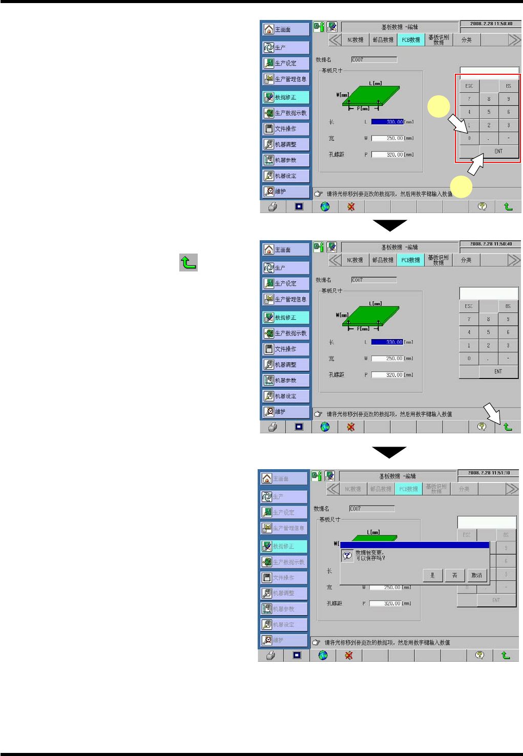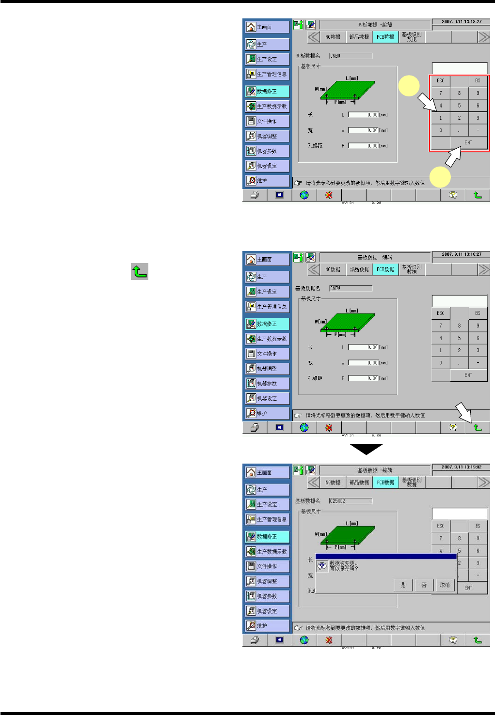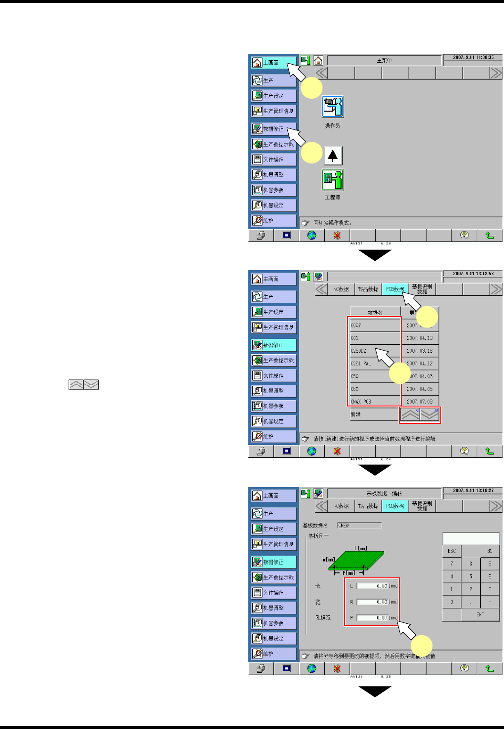 AV131 编程手册 5.2 新基板 数据的编制和 编辑 D79PCC-41- 060-B0 5.2- 6 5.2. 2 基板数据的编辑 基板数据编辑功 能可以用于基 板数据编辑栏 中。 编辑 数据的步骤 2. 1. 显示 “ 主画 面 ” 。 按下 [ 主画面 ] 。 2. 显示 “ 数据修正 菜单 ” 画面。 按下 [ 数据修 正 ] 。 3. 显示 “ 基板数据 修正菜单 ” 画面 。 按下 [PCB 数据 ] 。 4. 指定…