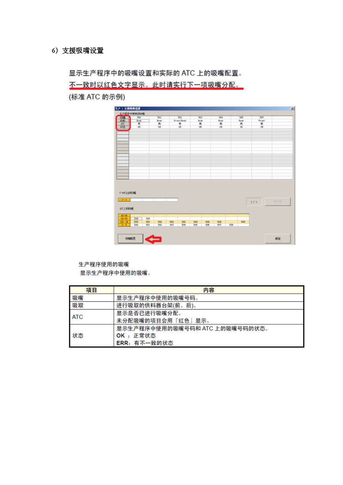 6 ) 支援吸嘴设置 显示生产程序中的吸嘴设置和实际的 ATC 上的吸嘴 SE ! 置 、 不一致时以红色立字显示 。 吐时谙实行下一项吸嘴分配 , ( 标准 ATC 的示例 ) hi * y 5 J 5 ax MC ] 令 生产程序使用的吸嘴 显示生产程序中使用的吸嘴 项目 内容 显示生产程序中使用的吸嘴号码 。 吸嘴 进行吸取的供料器台架 ( 前 、 后 ) , . 吸取 显示是否已进行吸嘴分配 . 未分配吸嘴的项目会用 「 红色 …