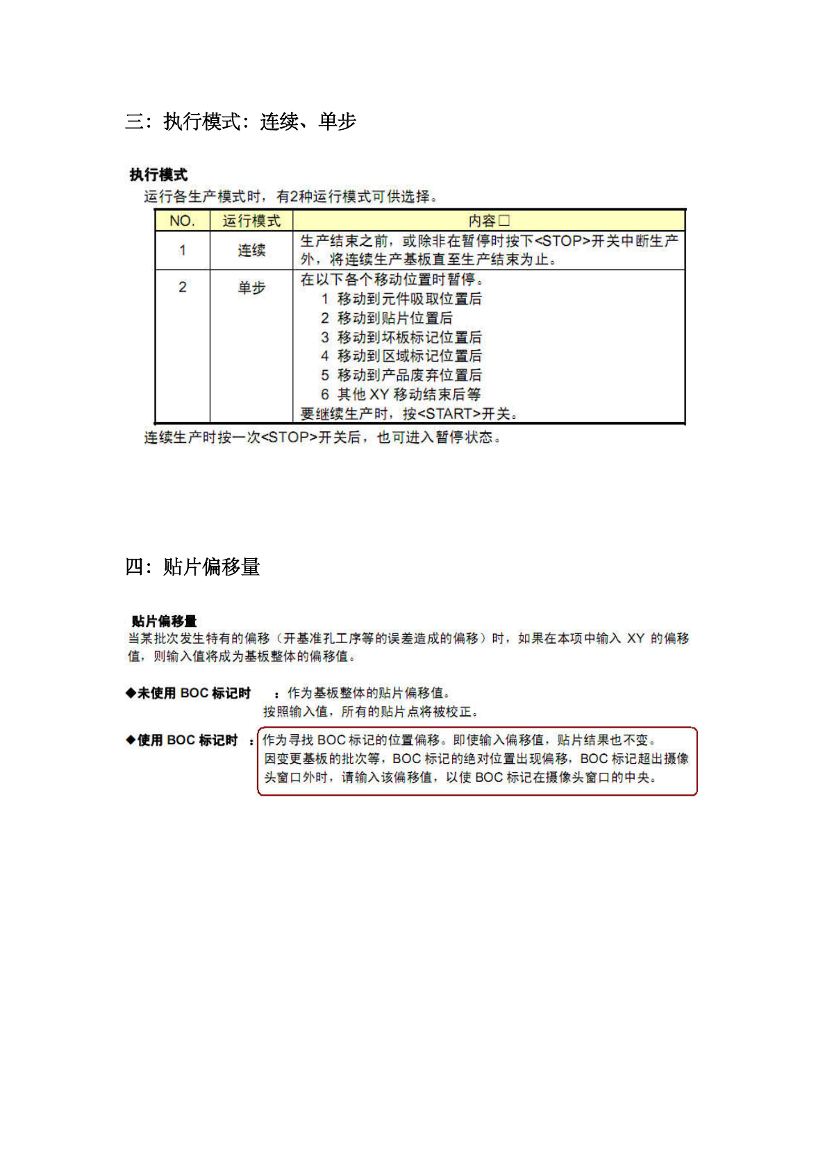 三 : 执行模式 : 连续 、 单步 执行横式 运行各生产模式时 , 有 2 种运行横式可供选择 3 运行模式 内容 □ NO . 生产结束之前 . 或除非在暂停时按下 < STOP > 开关中断生产 外 , 将连续生产基板直至生产结束为止 。 连续 在以下各个移动位置时暂停 : 1 移动到元件吸取位置后 2 移动到贴片位置后 3 移动到坏板标记位置后 4 移动到区域标记位置后 5 移动到产品废弃位置后 6 其他 XY 移动…