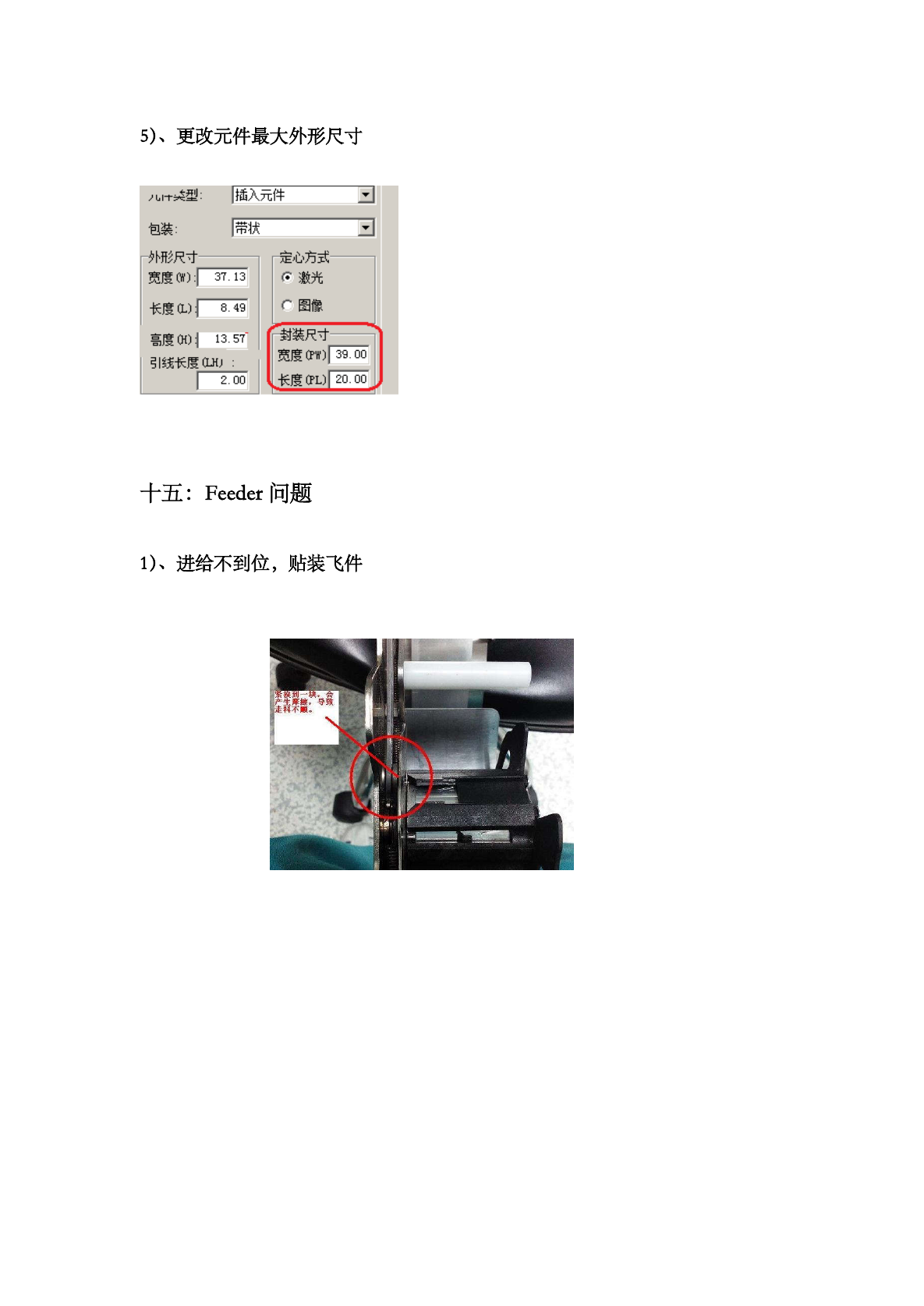 将此物料的封装 尺寸改少 ,设备默认物料元 件不会干涉,则不 会交换吸嘴了 。 查看 Feeder 走 料机构与 卷带轮有无摩擦 5 ) 、 更改元件最大外形尺寸 八 | 卞矣型 : | 插入元件 包装 : 外形尺寸 - 宽度 ⑽ : 「 - ^ 心方式 _ < 5 ■ 激光 r 图像 37.13 长度 a ) j " f 度 oo | _ 引线长度 CLHJ : 8.49 0 装尺寸一 宽度 CPW ) | 39.00…