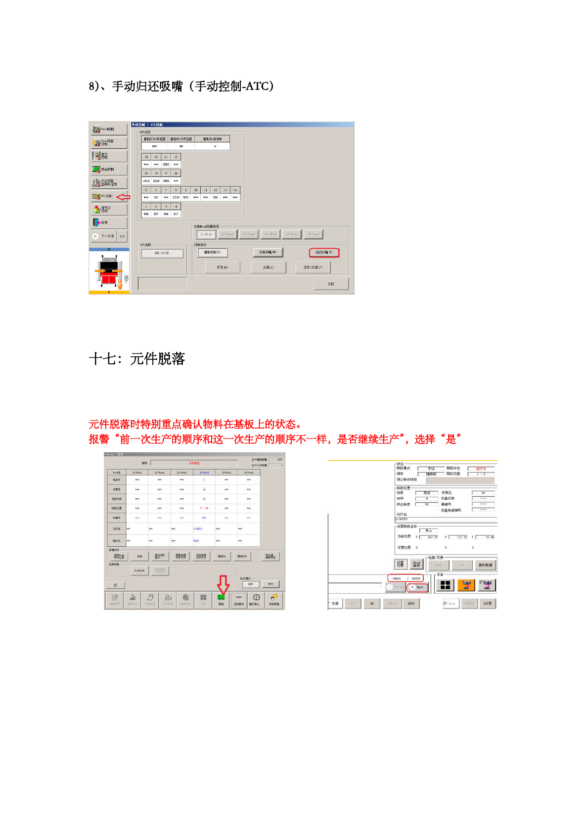 若吸嘴在贴装 头上时,可使用手 动控制 -A TC ,可以单独选择 头,使取下吸嘴 。 使用“跟踪功 能”示教吸取位置 ,并选择“是 ” ,继续生产 示教吸取位置 , 只会体现元件脱落的 异常料站 (如图 00001 、 00002 ) , 点击 N ext , 逐个教示。 8 ) 、 手动归还吸嘴 ( 手动控制 - ATC ) 挪 1 * 咖 | e 梅打开 ftssa : ■ § 板关闭 ftis 器 § 板开闭日 1 阉 pi…
