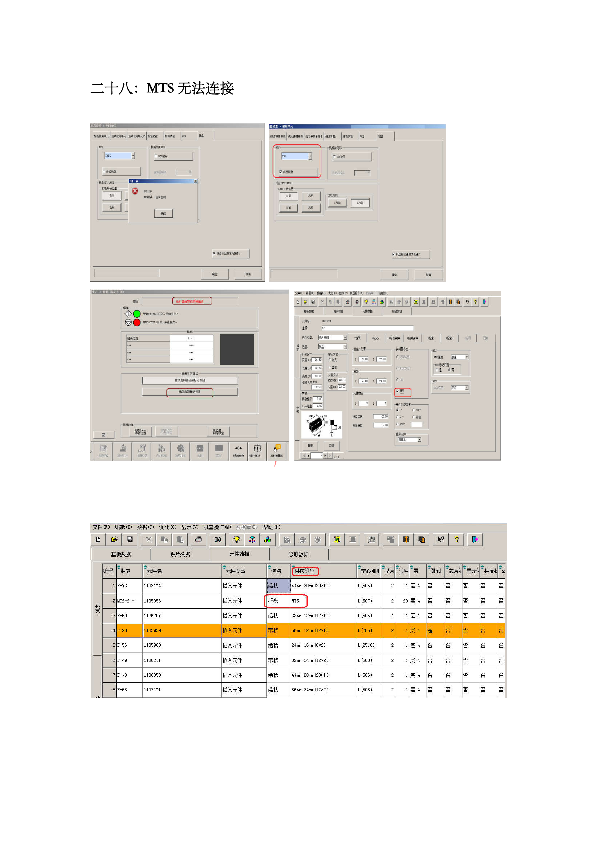 可临时更 改 tray 盘模式, 再改回来 , 并更改 元件库使 之使用 tray 盘, 因 重新连接 tr ay , 设备第 一次会识 别 tray 台车标示 错误, 因设备会自 动识别第一盘 , 但生产时都是 从第二盘开始生产 的,因此无法 识别,点击“无效 台车标记验证 ”即可。 当元件数据中 的托盘显示为 MTS 时,代表 Tr ay 盘可连接 。 二 十 八 : MTS 无 法 连 接 h h I \ \ A 赛 侵 PI…