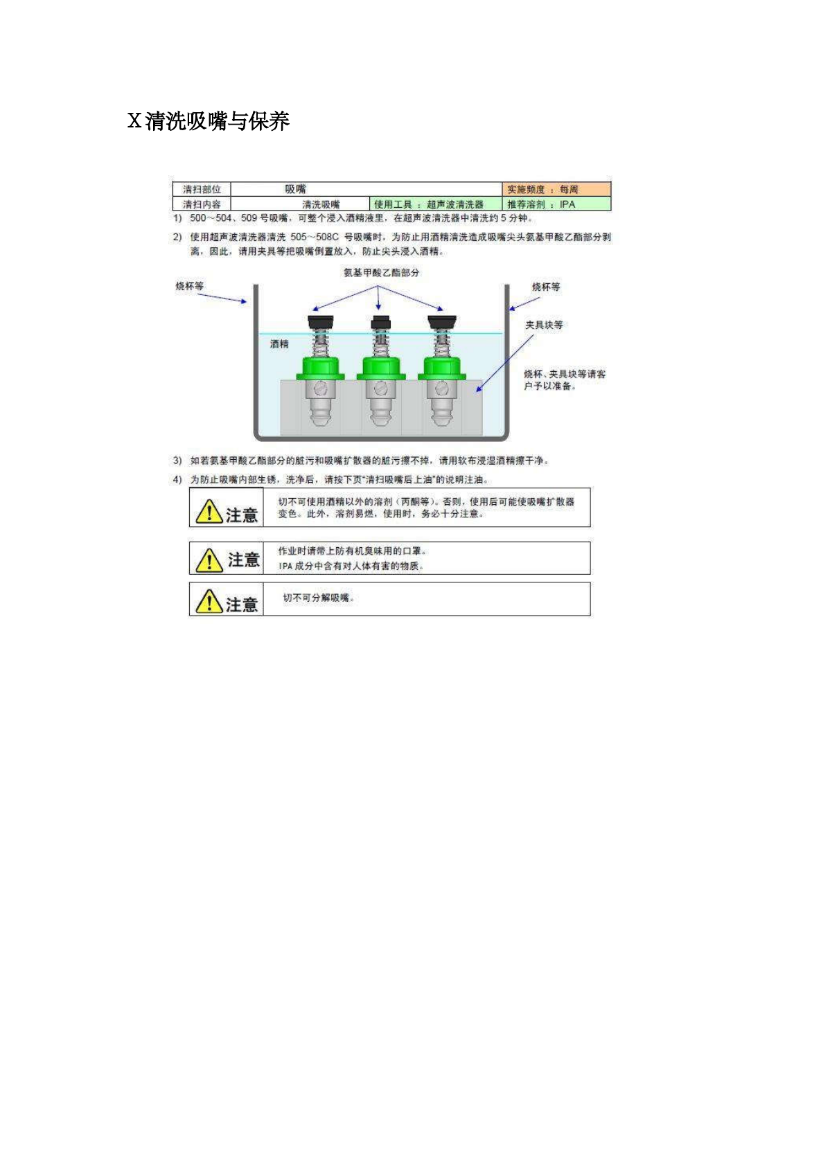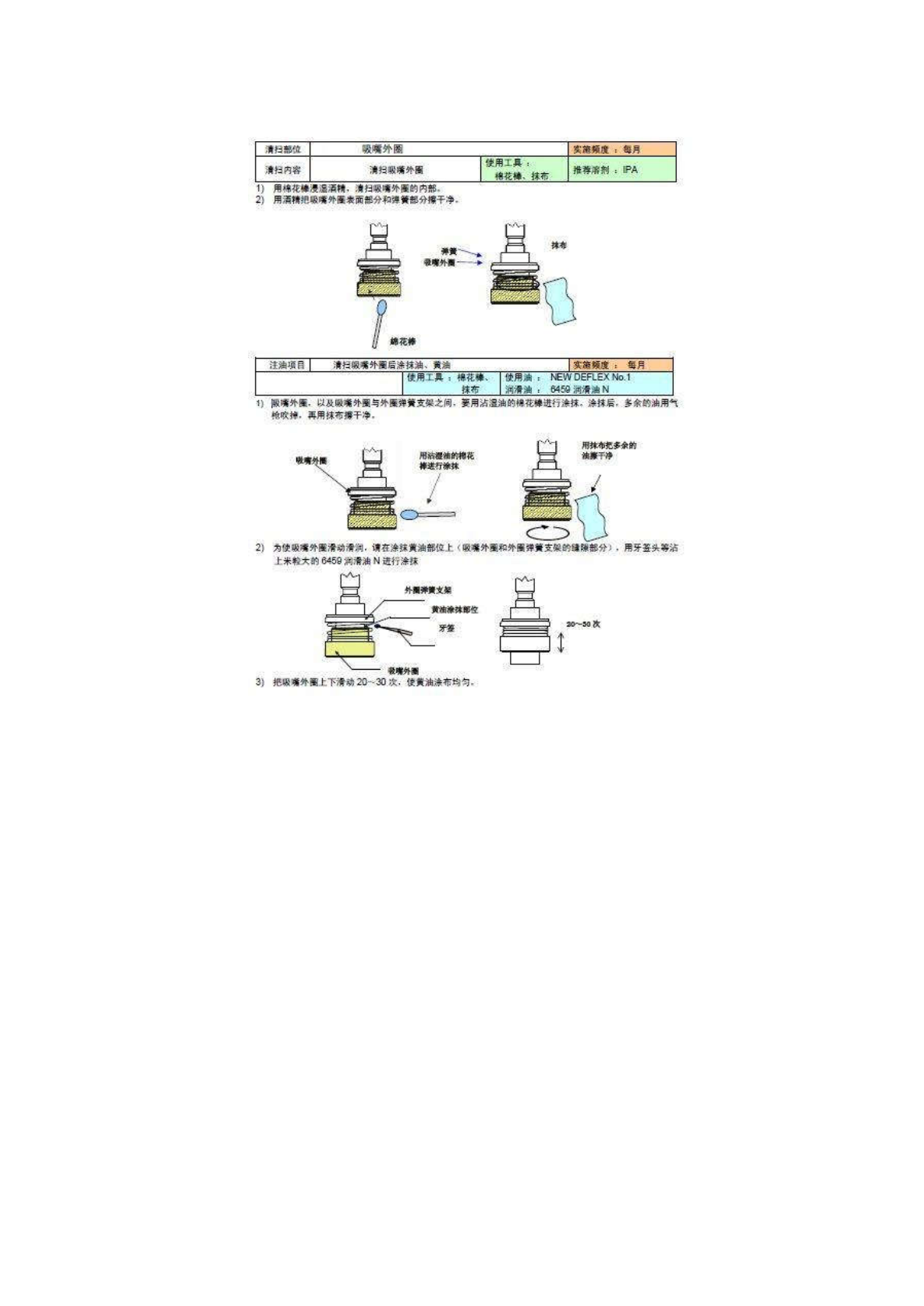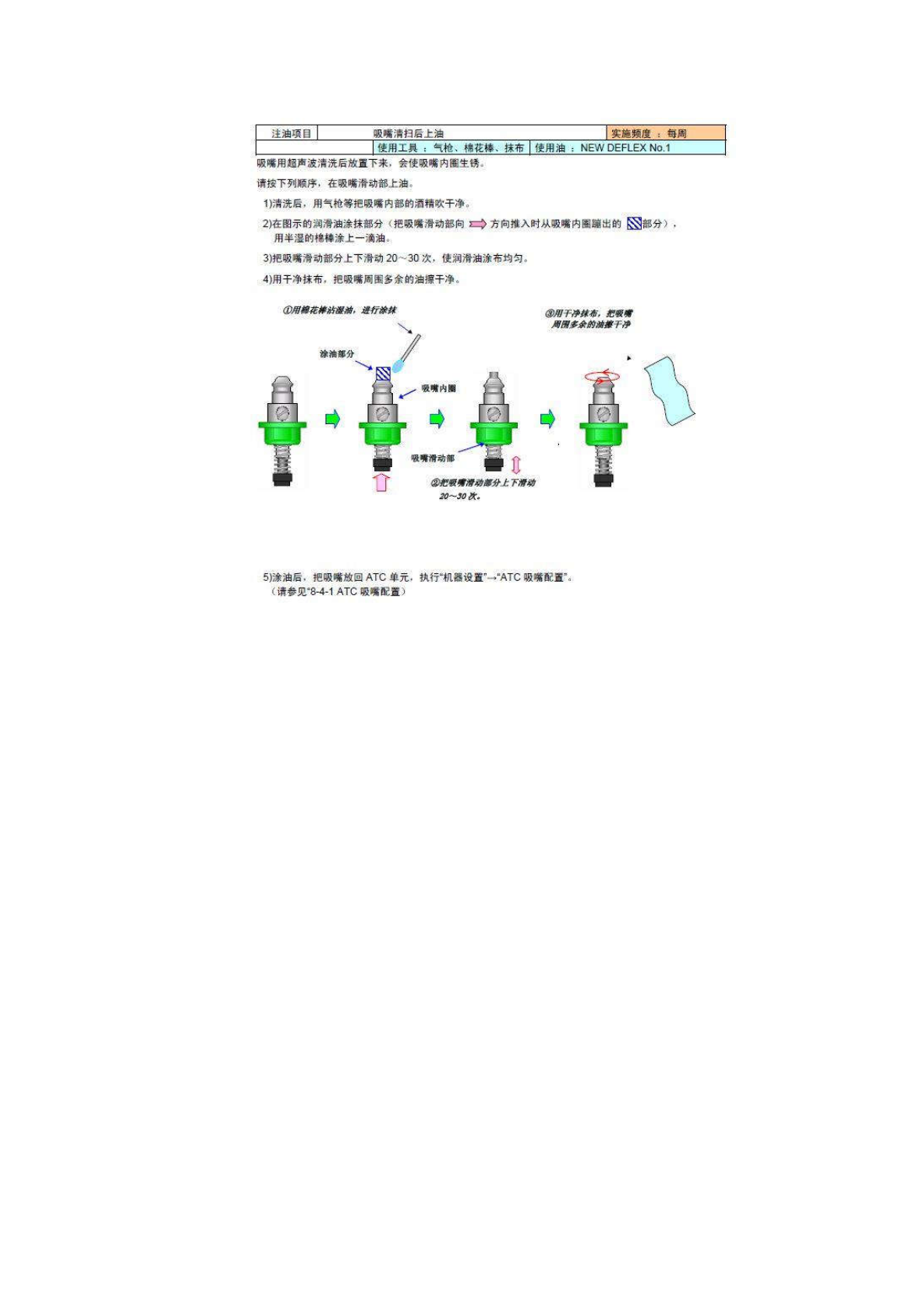 注油项 a I 实施频度 : 每周 吸嘴清扫后上油 H 怜 , 纹兑样 , S 布 油 : NEWDEFLEXNoJ 吸嘴用超声波清洗后放置下来 . 会使吸晡内 生锈 。 请按下列顺序 . 在吸嘴滑动部上油 . 1 ) 清洗后 . 用气枪等把吸嘴内部的酒精吹干净 . . 2 ) 在图示的润滑油涂抹部分 ’ . 把吸嘴滑动部向方向推入时从吸嘴内圈蹦出的 @ 部分 〉 . 用半湿的棉样涂上一滴油 . 3 > 把吸嘴滑动部分上下滑动…