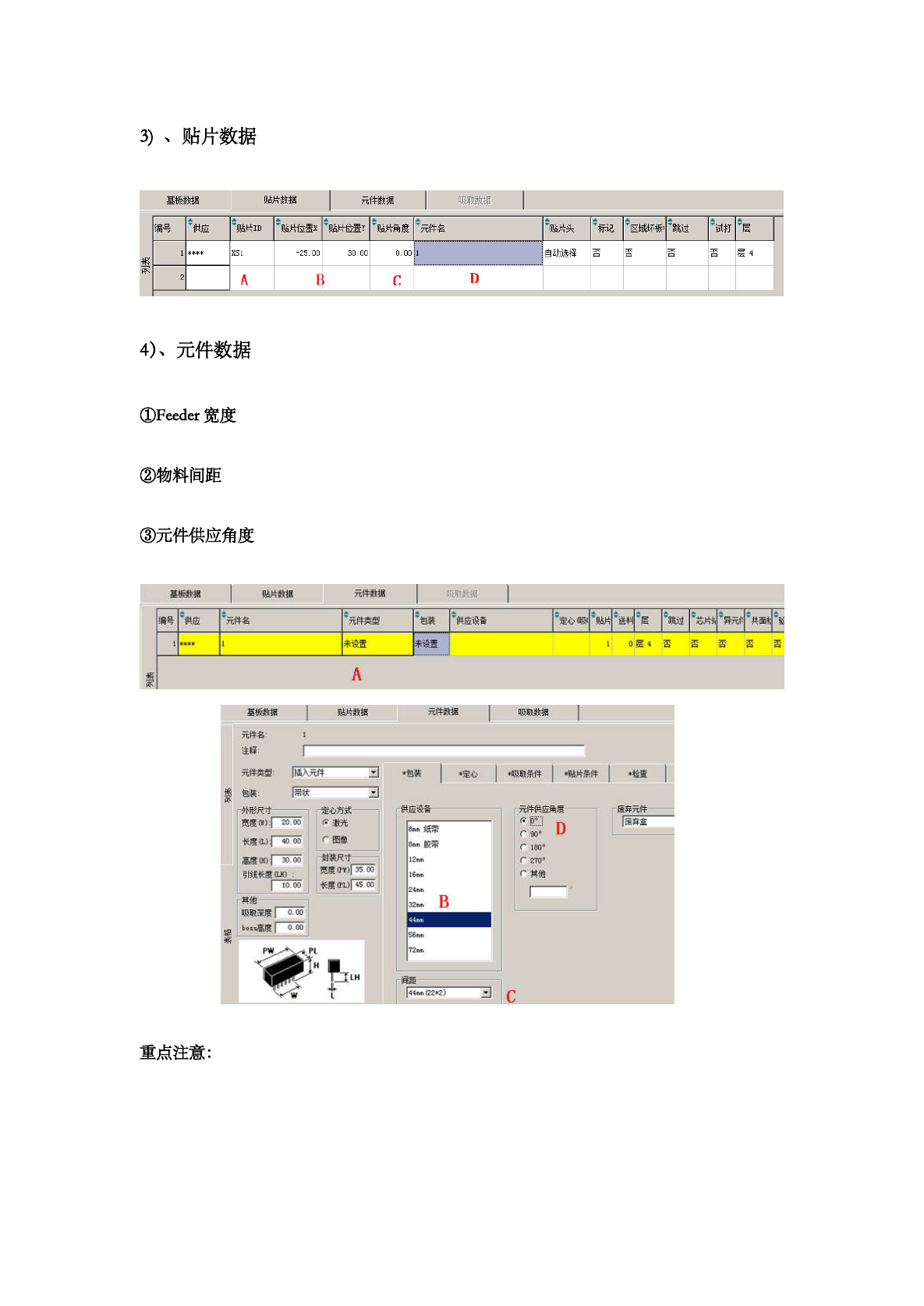 此过程需重点查看 Feeder 宽度及 Pitch,若未确认正确,后续更改时,吸取数据中的元件信