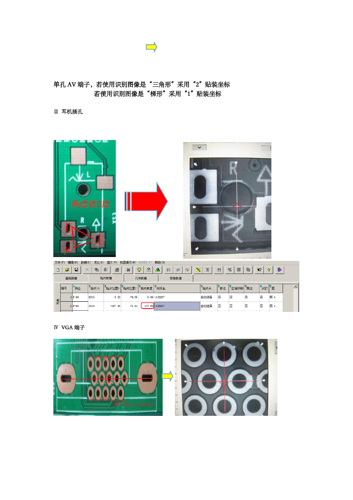 单孔 AV 端子 , 若使用识别图像是 “ 三角形 ” 采用 “ 2 ” 贴装坐标 若使用识别图像是 “ 梯形 ” 采用 “ 1 ” 贴装坐标 m 耳机插孔 文 件 CF ) 编 辑 CE 〕 数 掮 ( C ) 优 化 ( 0 ) 显 示 ( V ) 机 器 操 作 ( W ) 数 据 厍 CD ) 帮 助 00 D y x % a 必 搽 # , : 噶 ■ . 衫 7 卟 贴 片 数 振 基 板 教 据 亓 件 數 据 吸 取 教…