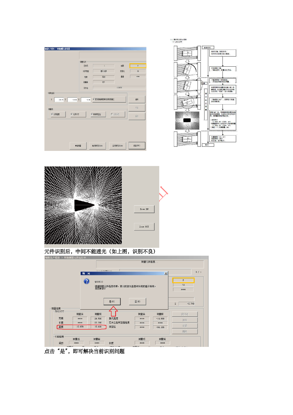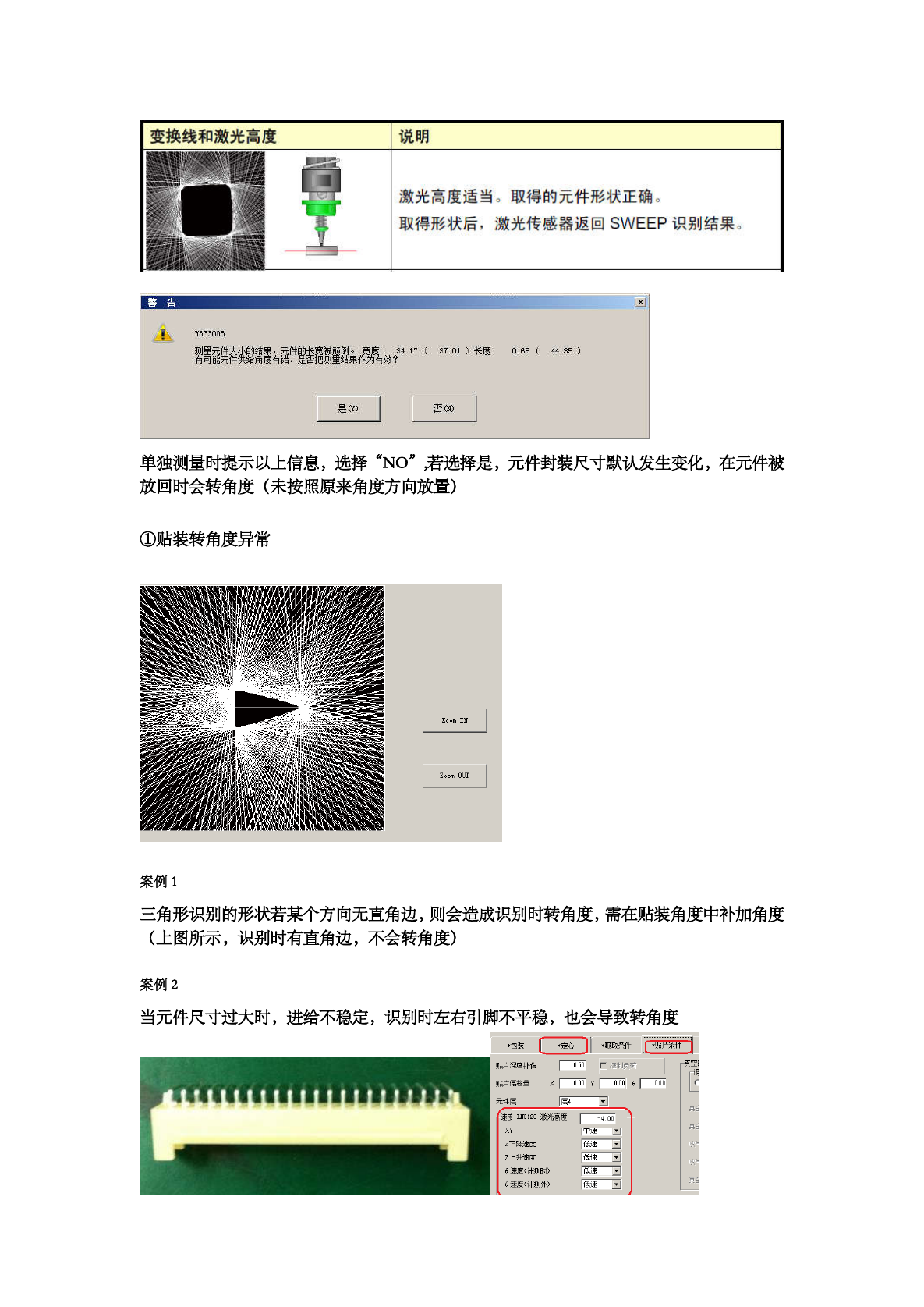 变换线和激光高度 说明 激光高度适当 。 取得的元件形状正确 。 取得形状后 , 激光传感器返回 SWEEP 识别结果 。 2 < J 鼷識祖疆驪議效 是 on S « 单独测量时提示以上信息 , 选择 “ NO ” 若选择是 , 元件封装尺寸龄炫生变化 , 在元件被 放回时会转角度 ( 未按照原来角度方向放置 ) ① 贴装转角度异常 案例 1 三角形识别的形状若某个方向无直角边 , 则会造成识别时转角度 , 需在贴装角度中补加角…