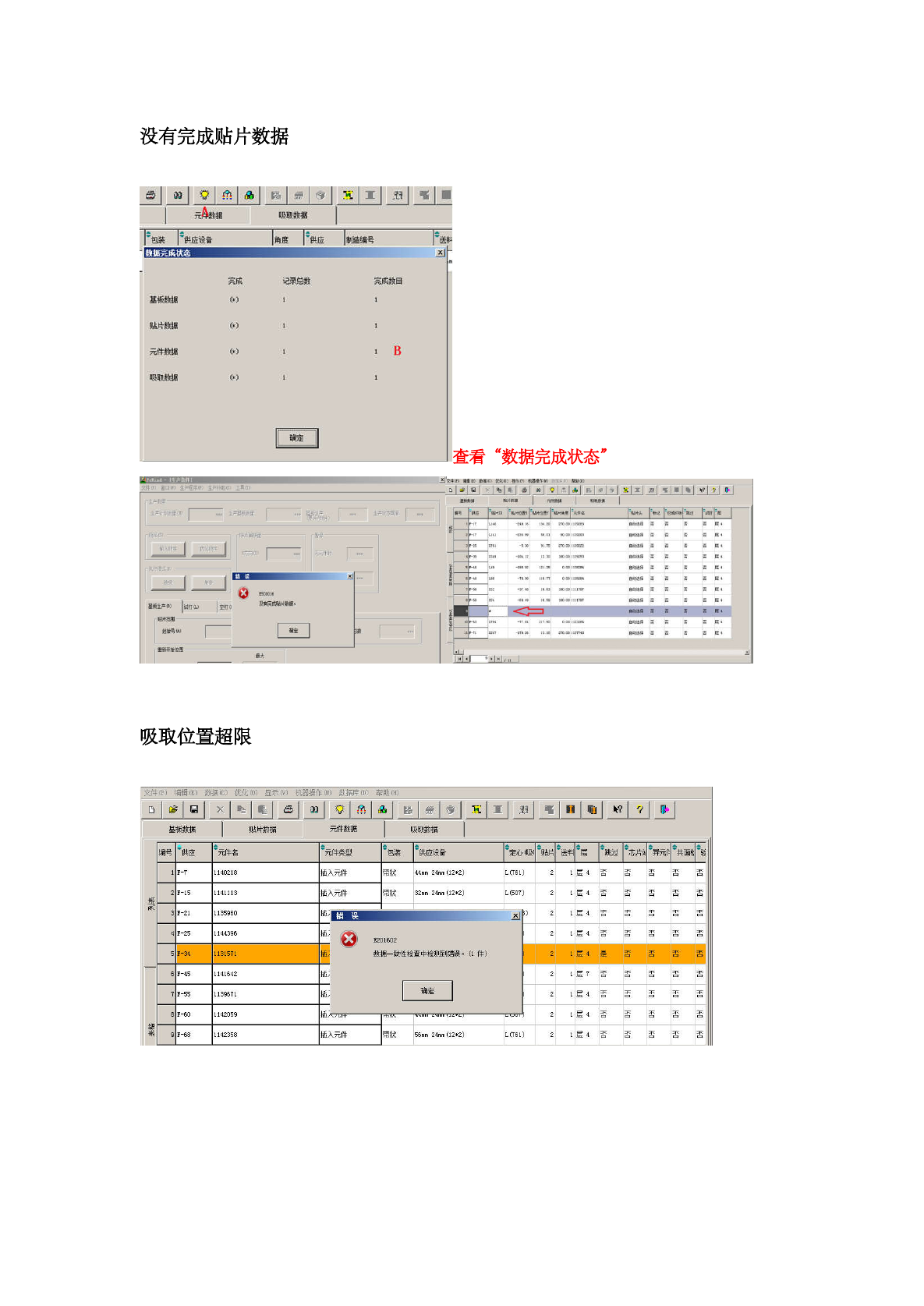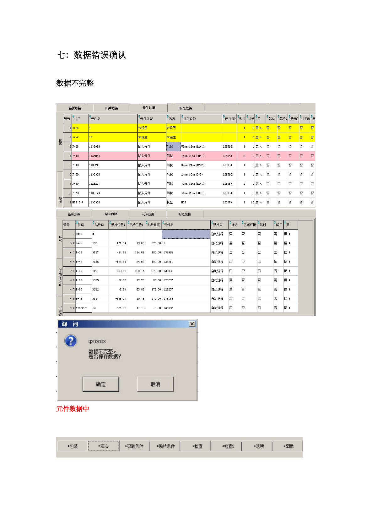 显示 红色代表, 此元件信息在贴装数 据中无任何贴装 信息, 未 添加到贴装数据 中。 黄色的代 表,代表此 元件无任何注册数据 ,元件库未编辑 ,库不对。 保存时报错“ 数据不完整” 程序制作完成 后,元件数据中所 有项目前 的 * 号必须存在, 若没有代表此项 目数据不完整 。 Q 203003 mmtm 确定 取消 元件数据中 I 巧心 响装 2 * ® JjS 自 动 迭 择 否 S 层 4 # 自动迭择 否 否 否 否 层 4…