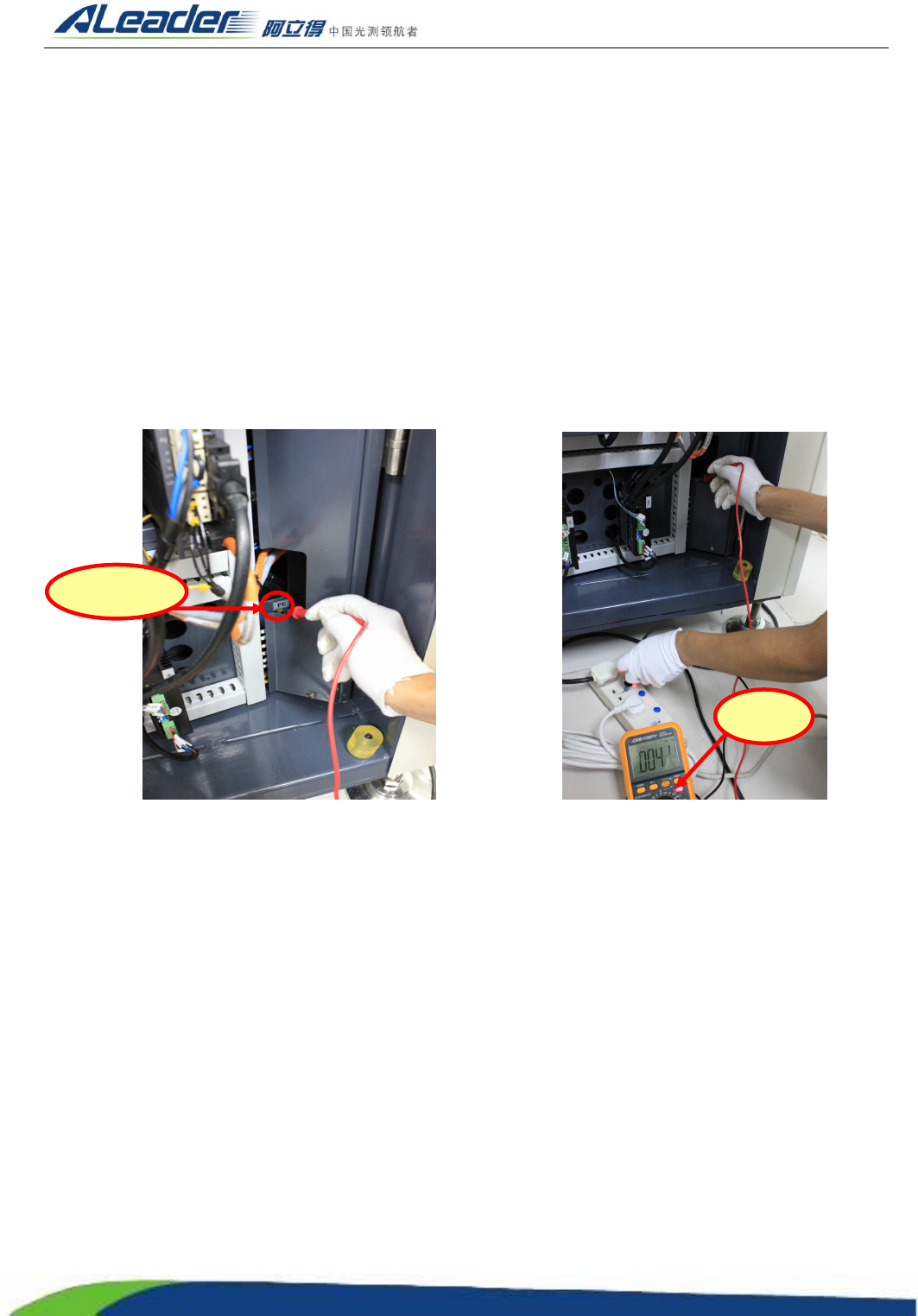 ④ 将一表笔与机器后面的接地端子排铜条接触,另一表笔与机器供电插排